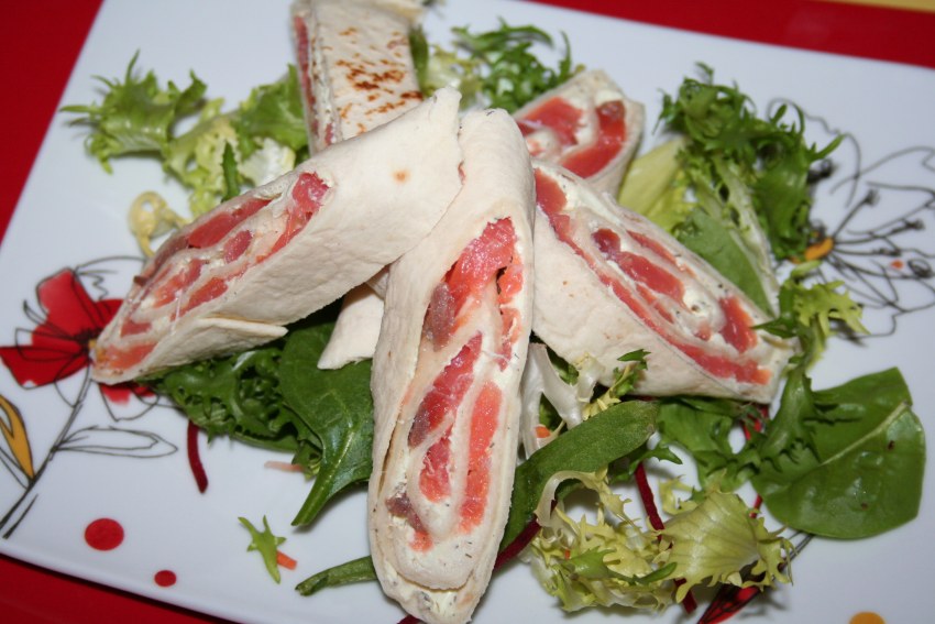 Рулетики из лаваша с красной рыбой и творожным сыром и салатом