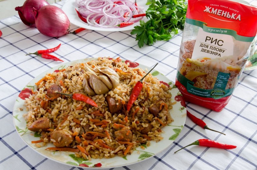 Фото в белом фоне плов с верху в однаразовай ланчбокс
