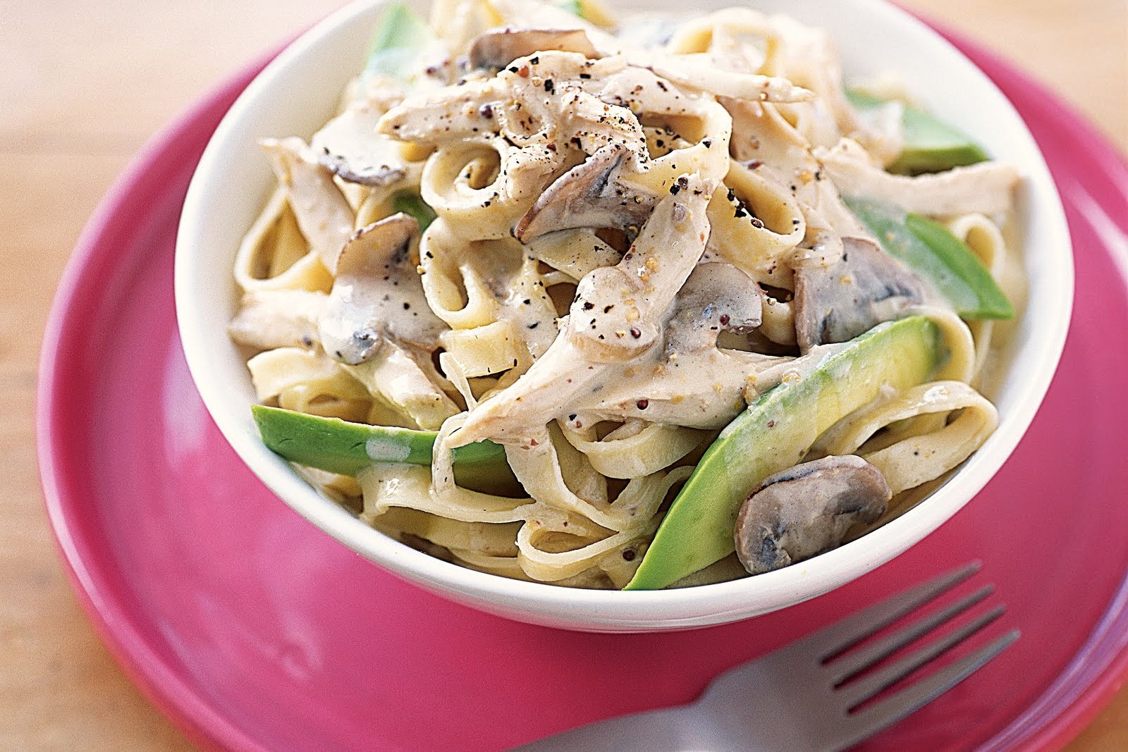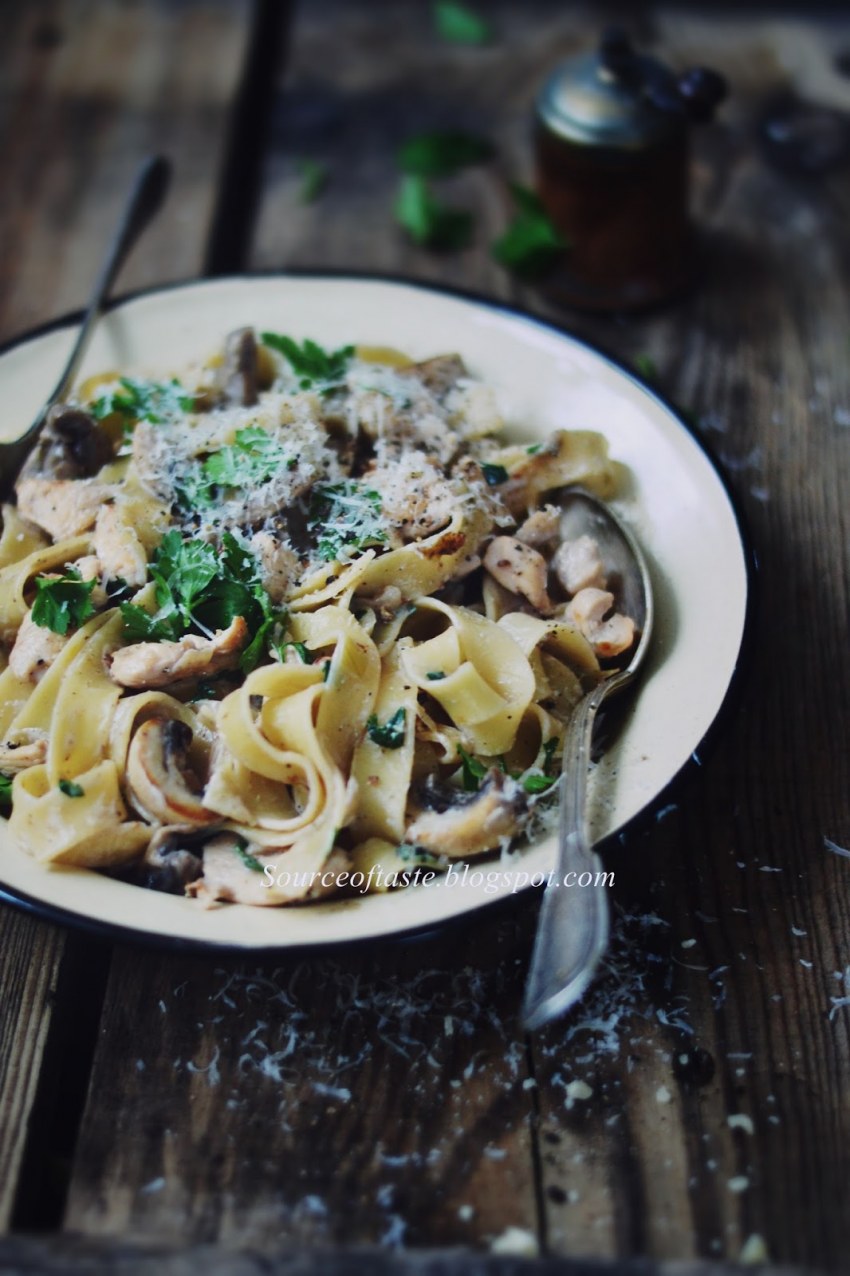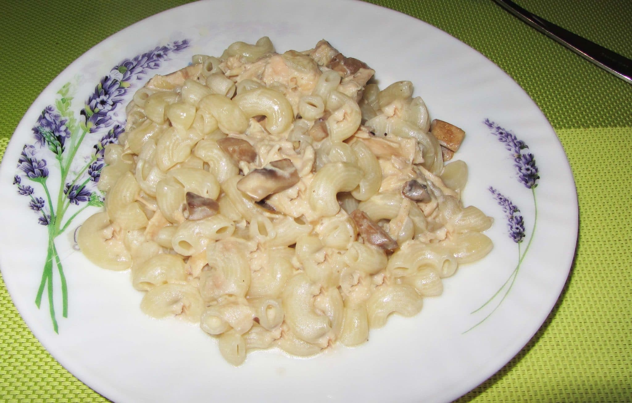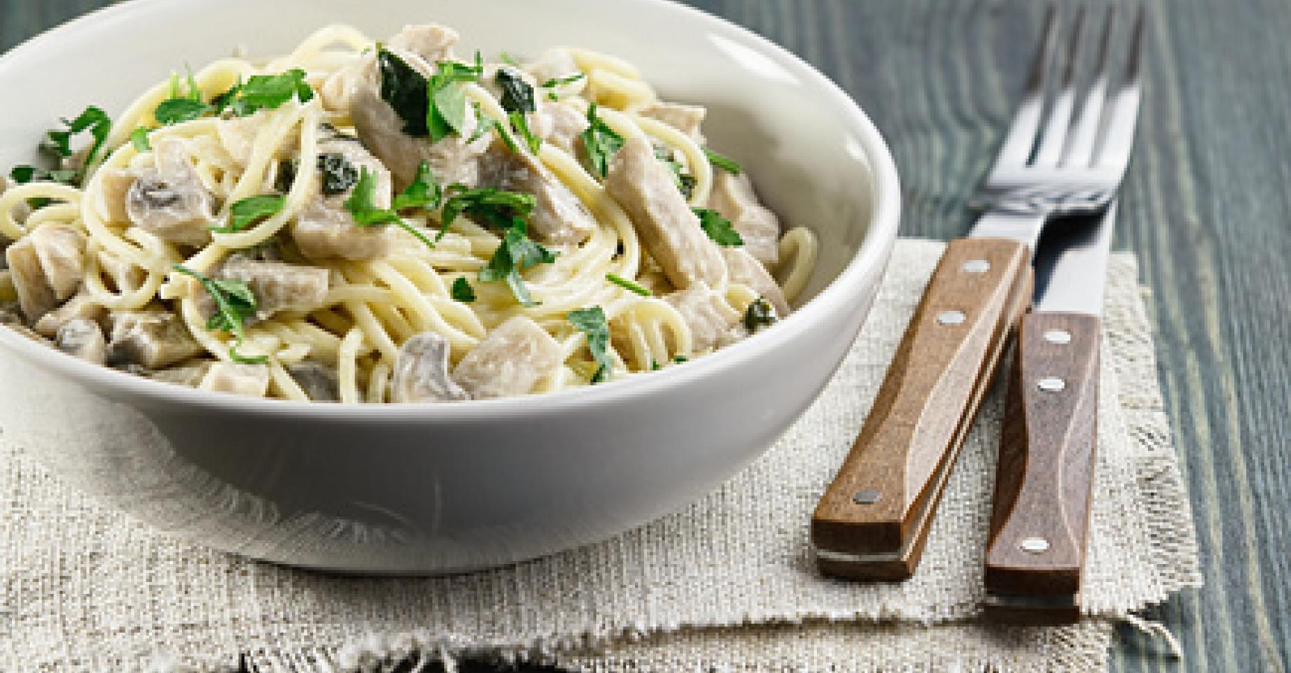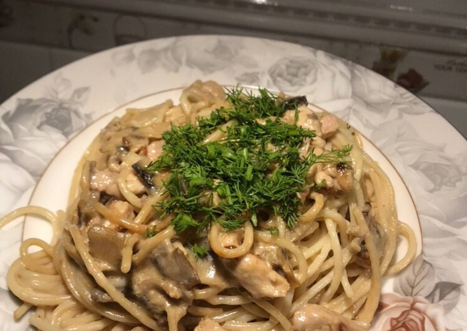 Макароны с курицей и грибами в сливочном соусе