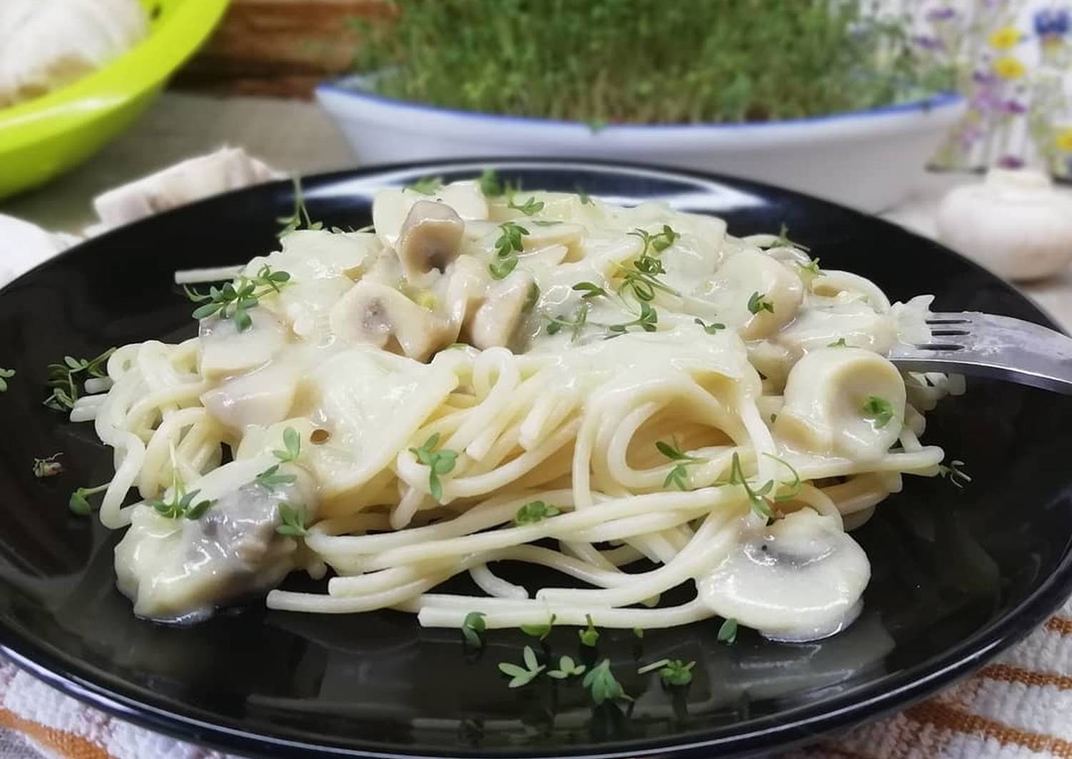 Спагетти в сливочном соусе с вешенками