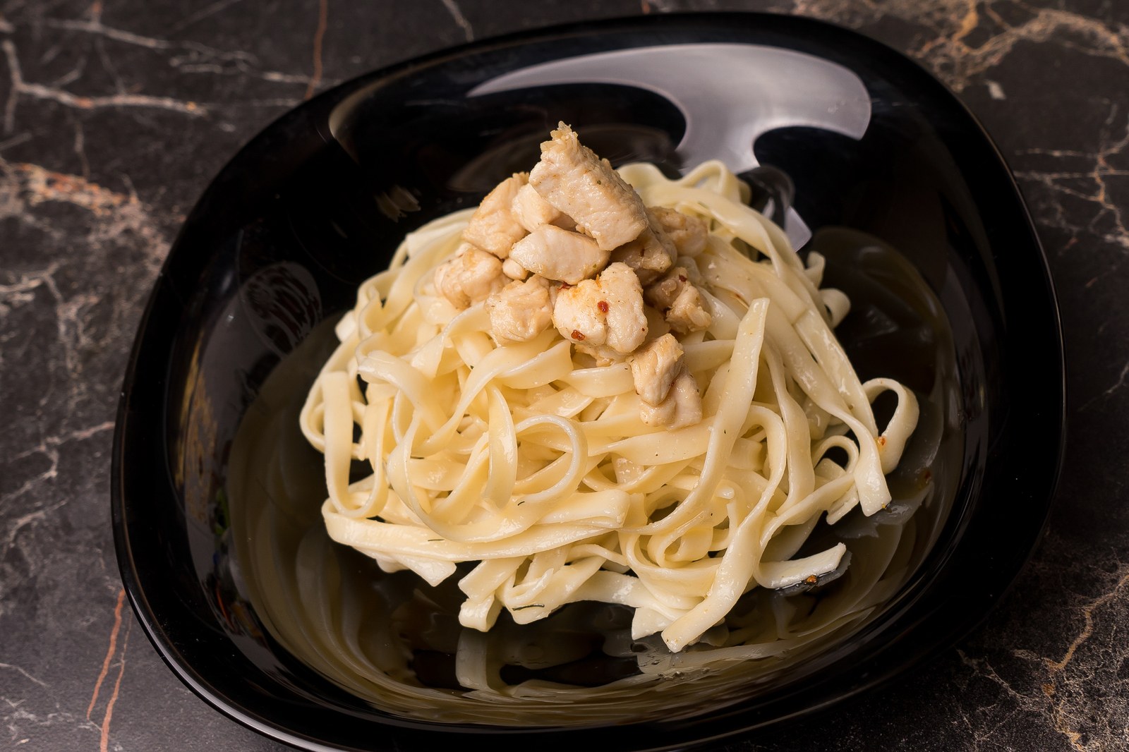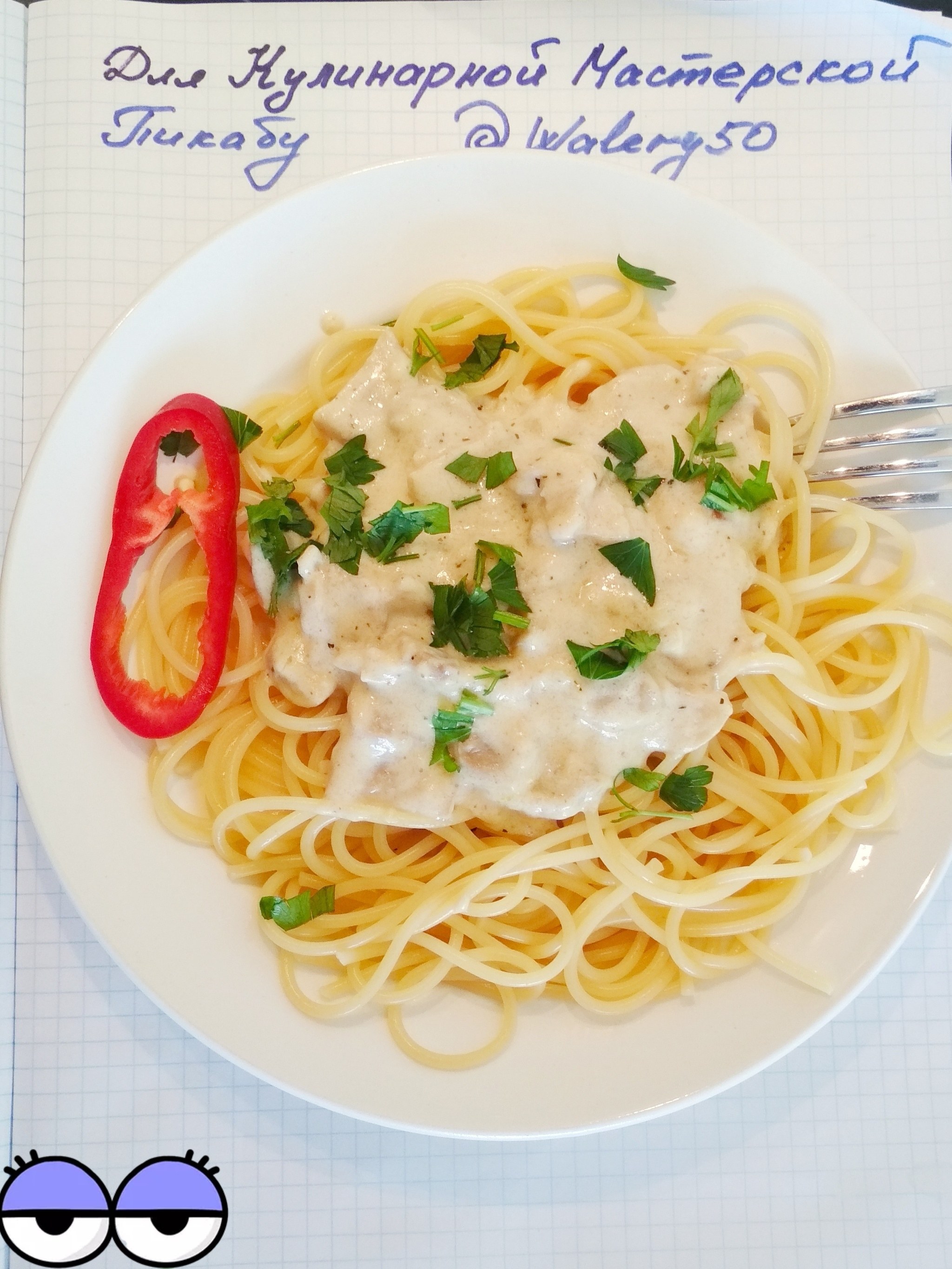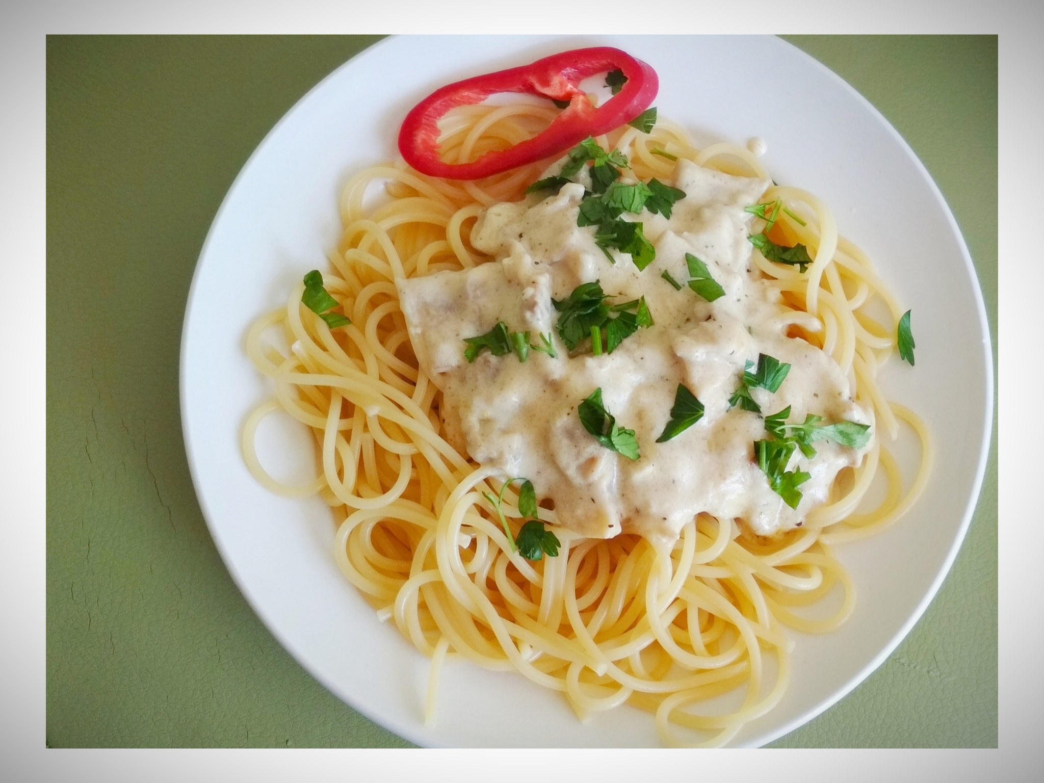 Спагетти с курицей в сливочном соусе с сыром
