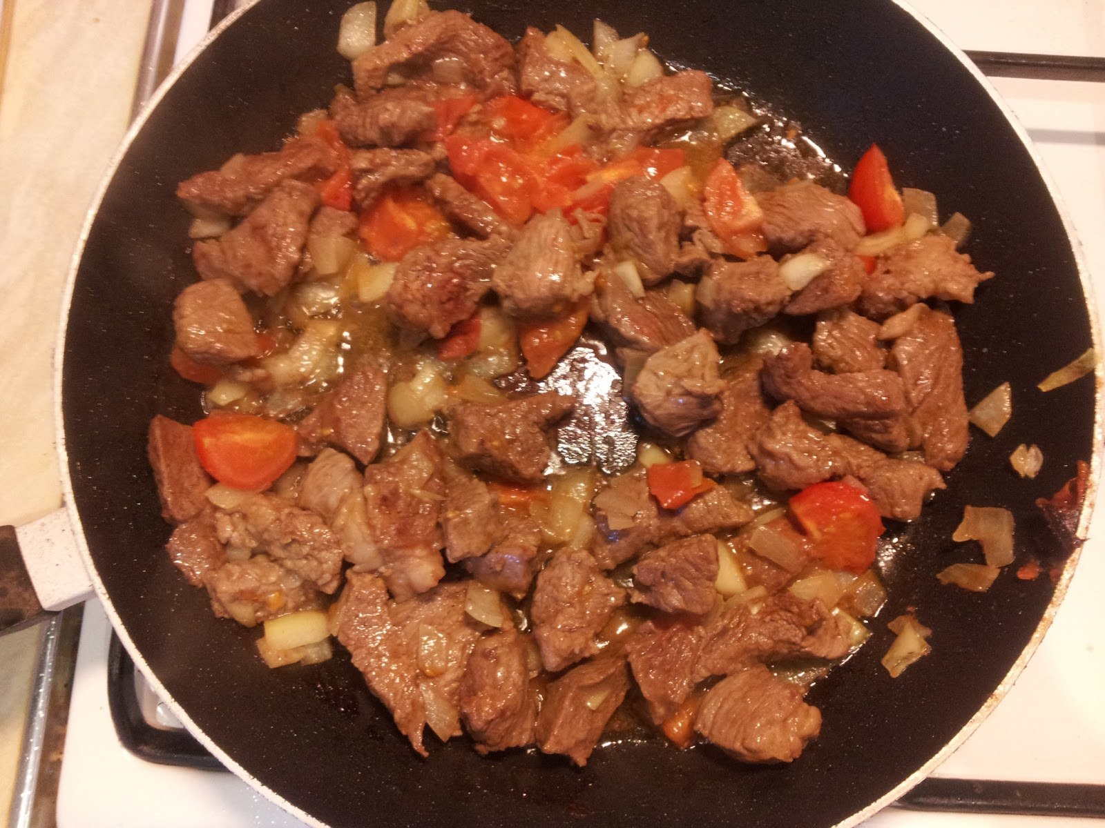 Тушёная говядина с луком на сковороде