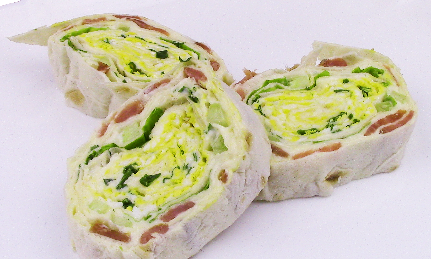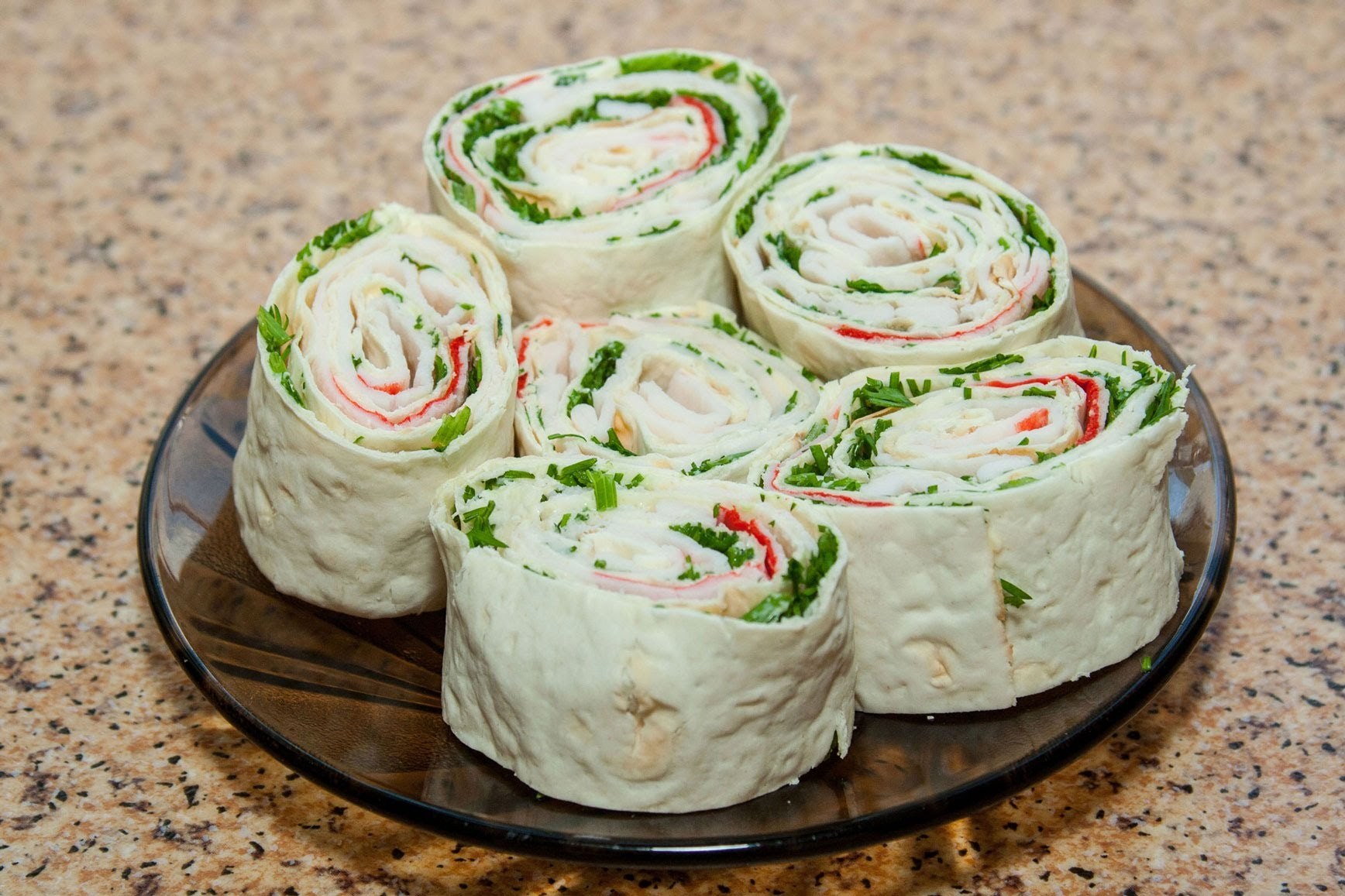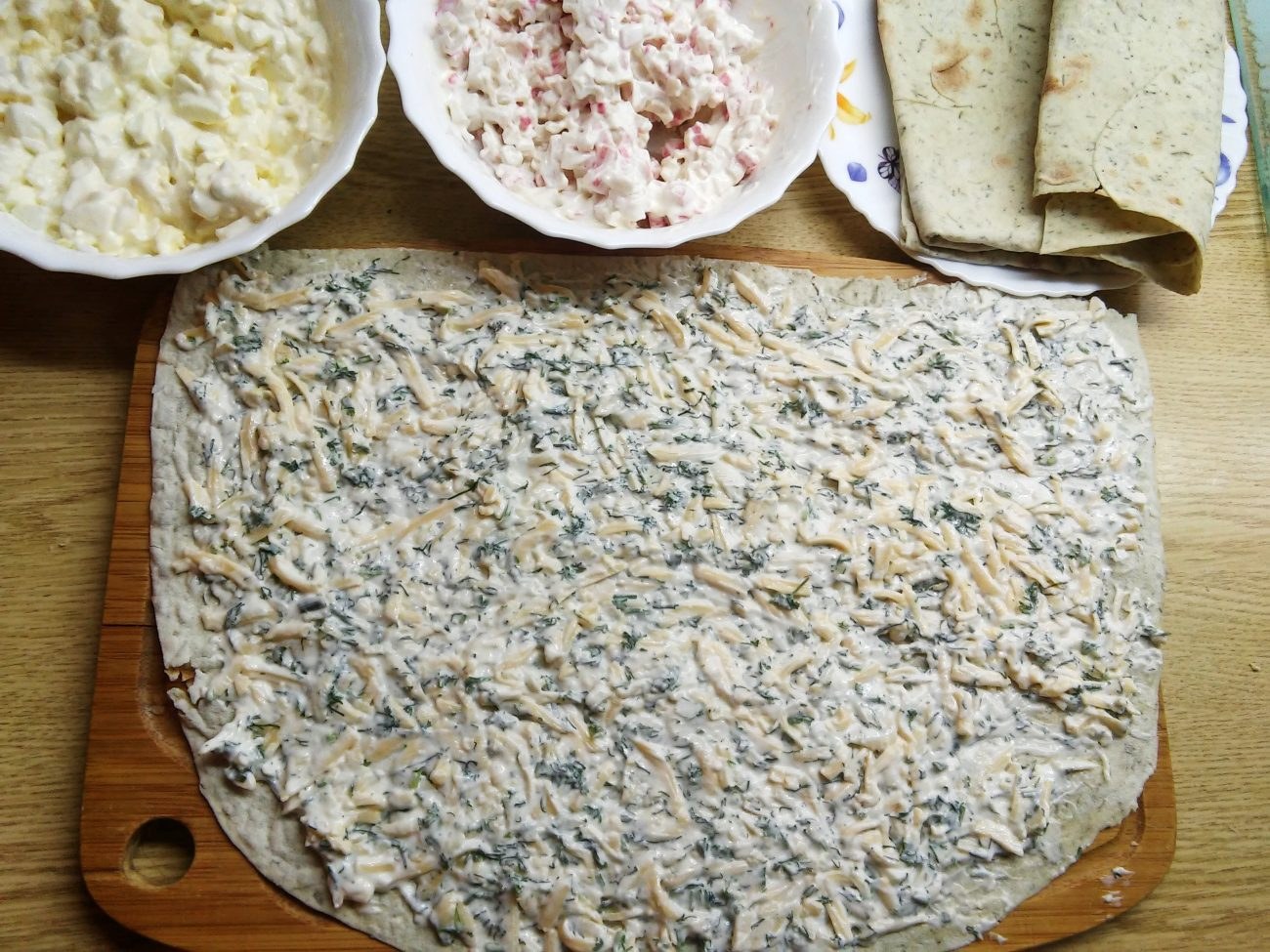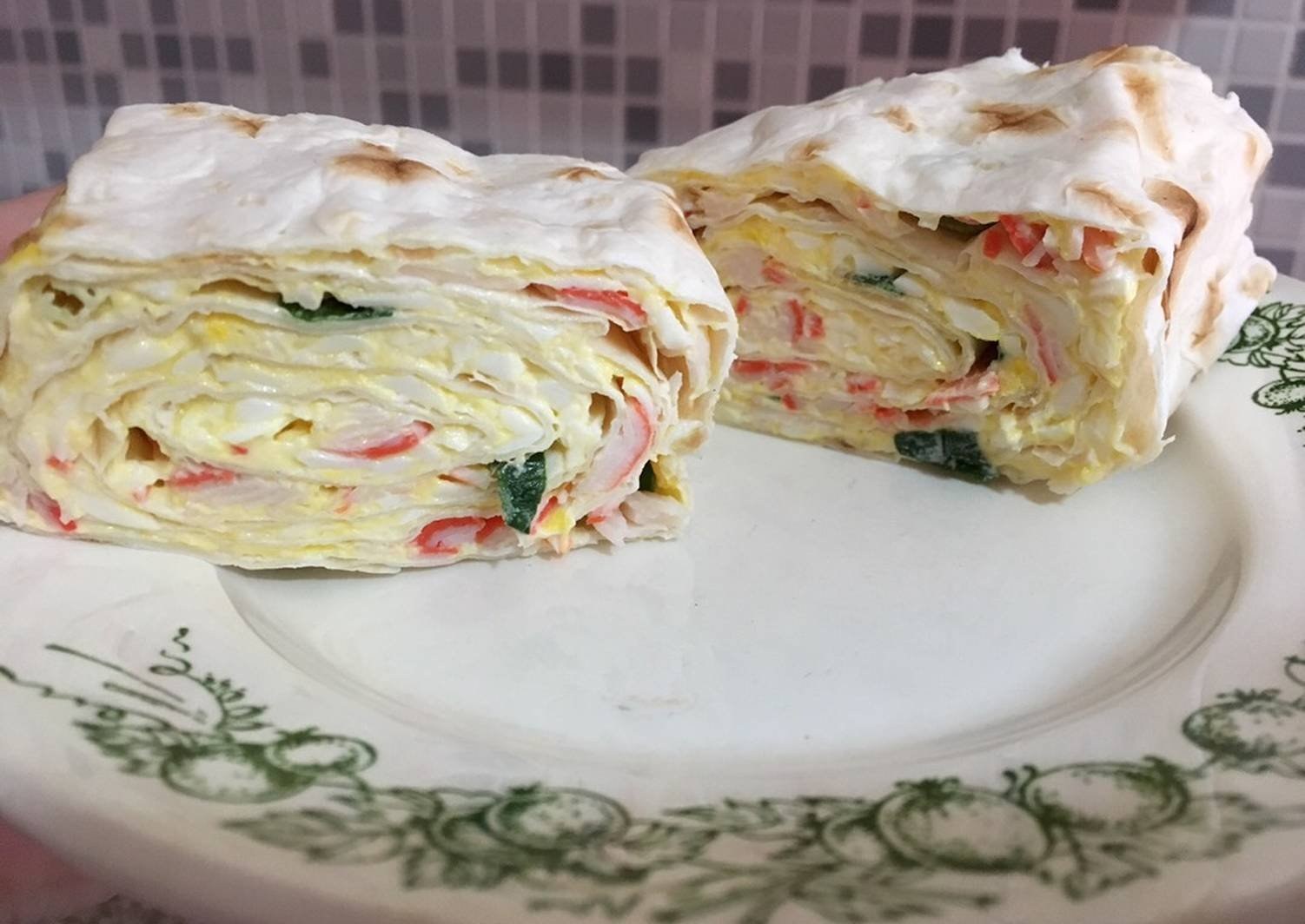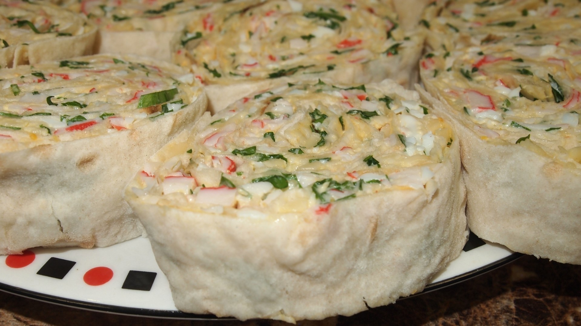 Рулетики из лаваша с крабовыми палочками и сыром и яйцом