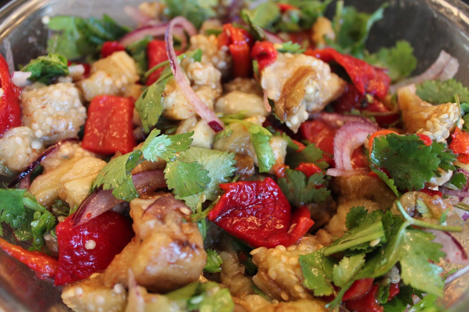 Салат с баклажанами и помидорами и кинзой