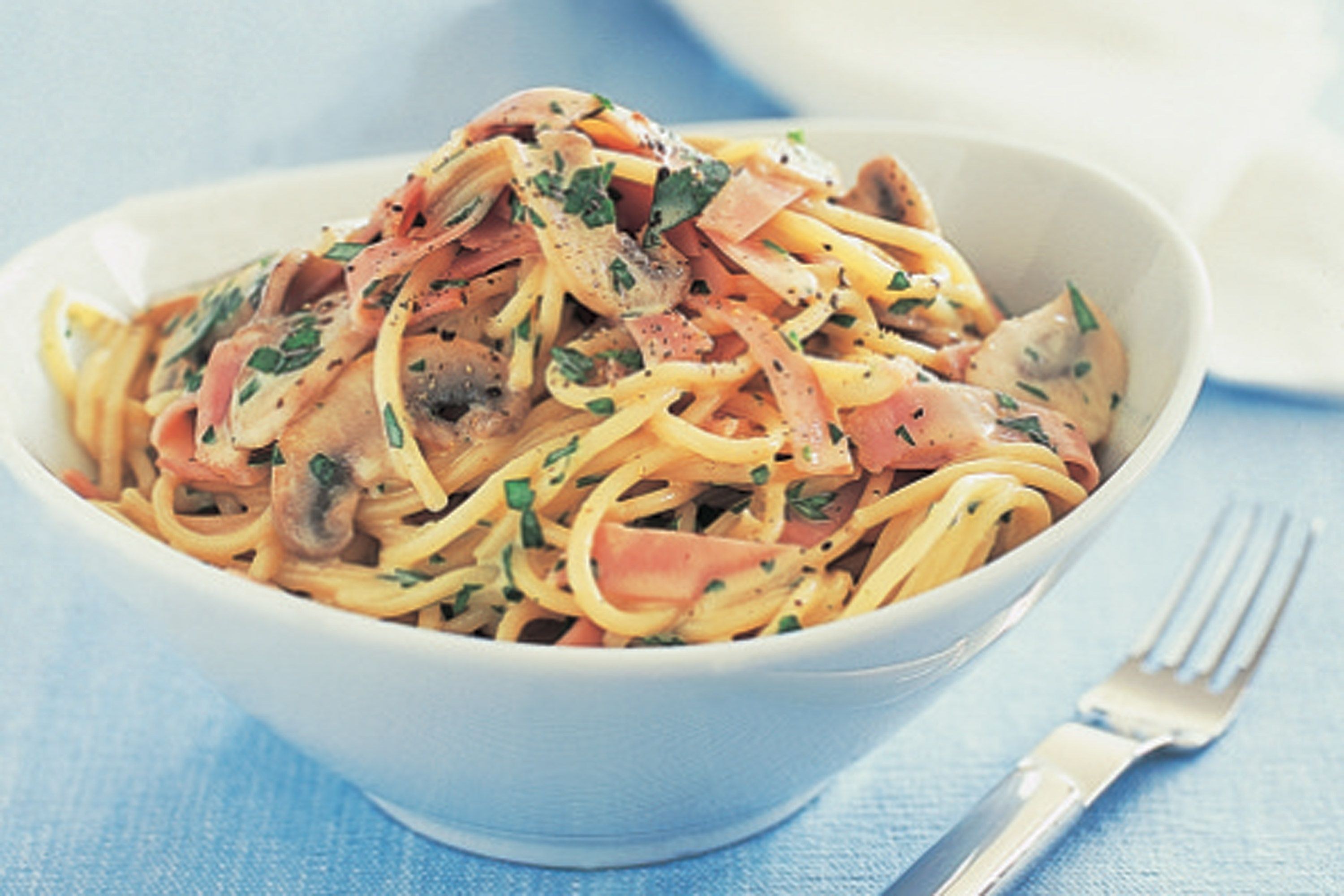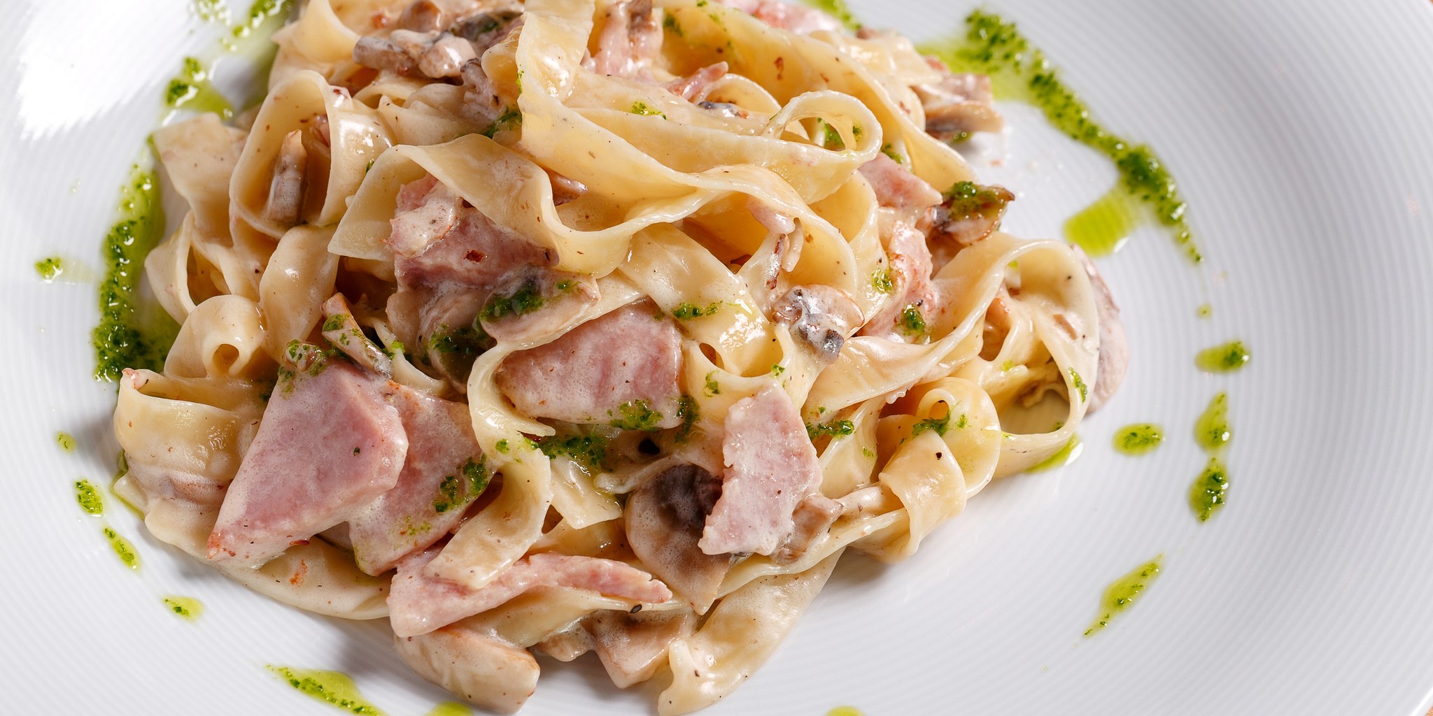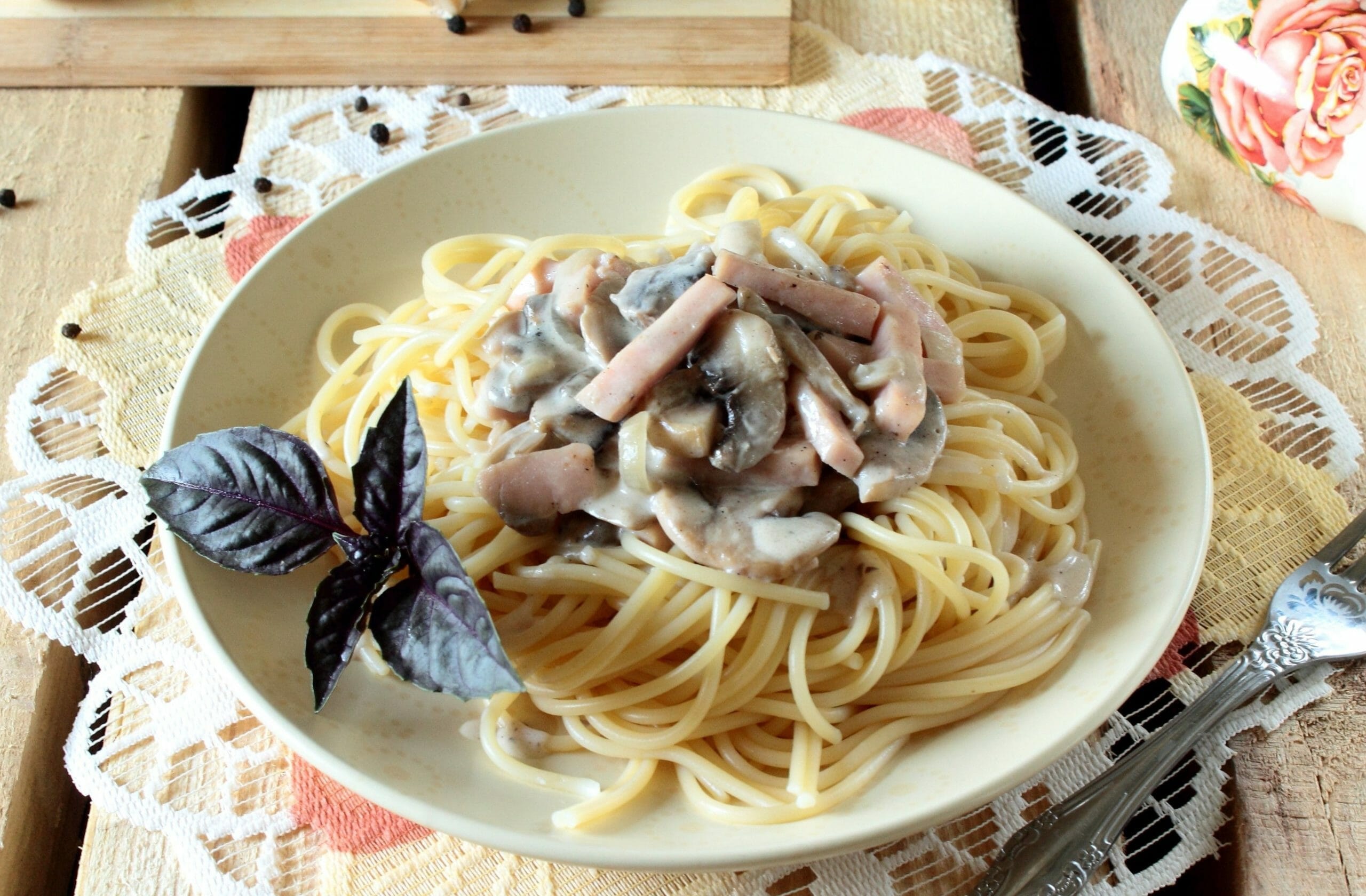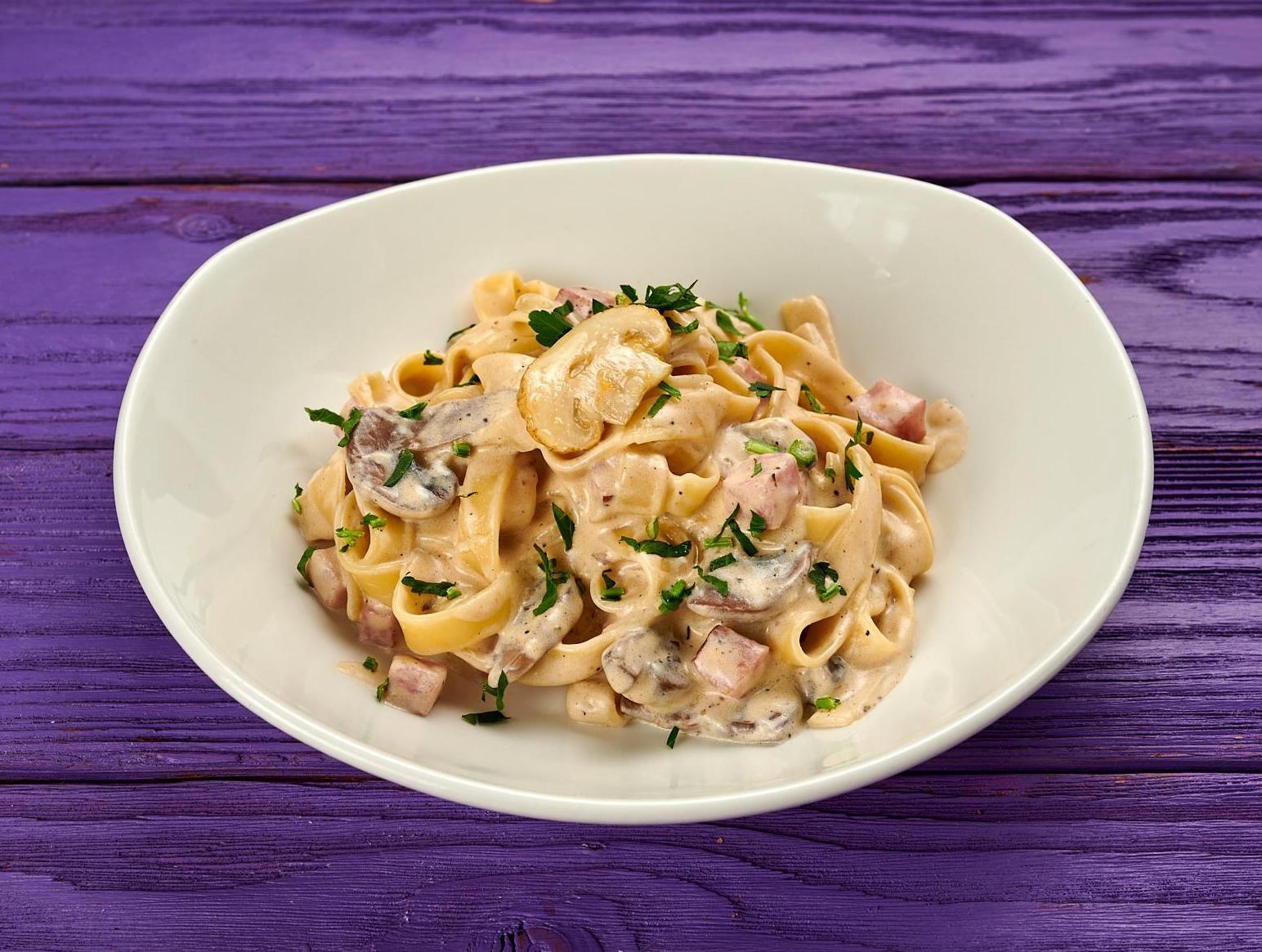 Фетучини с ветчиной и грибами в сливочном соусе