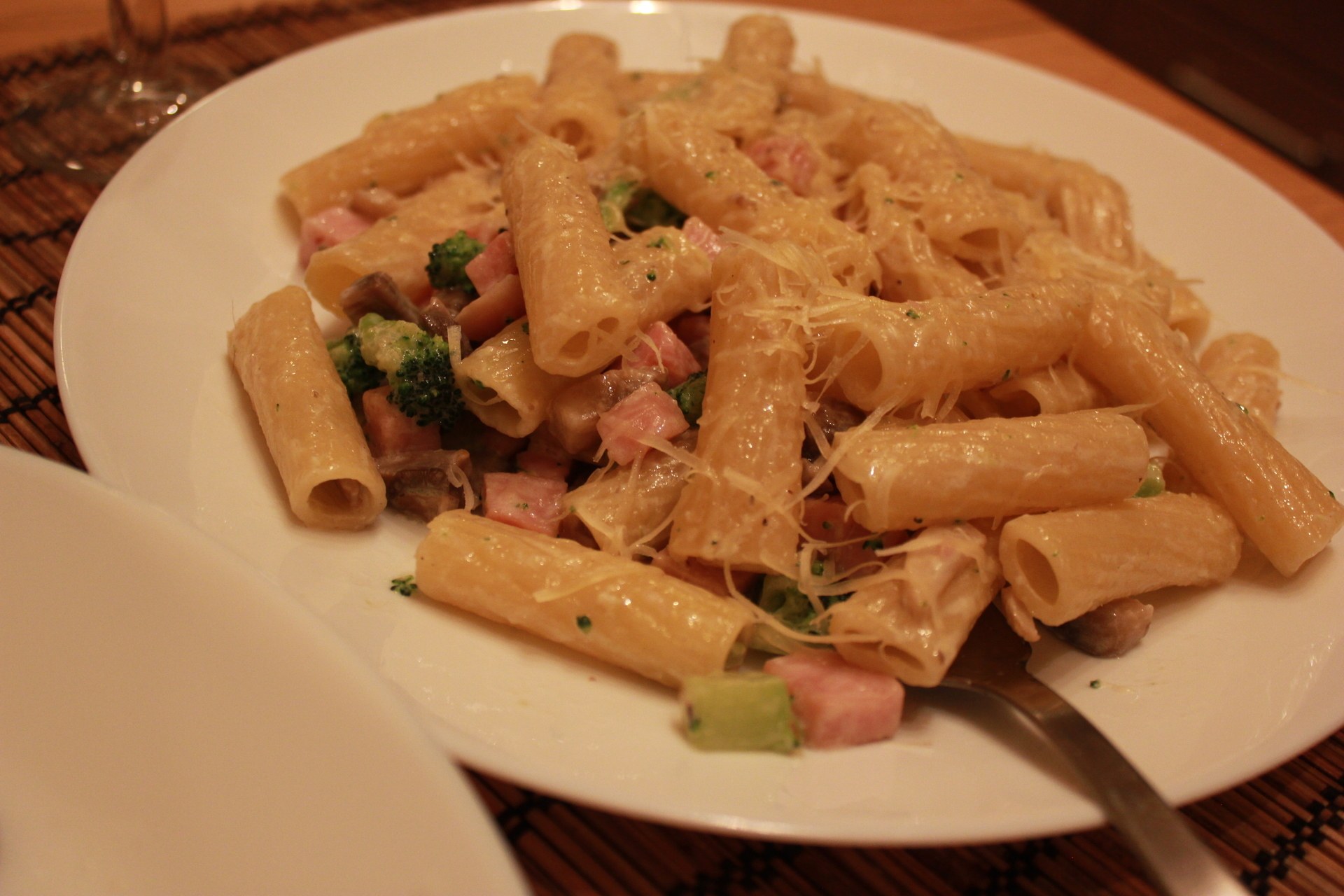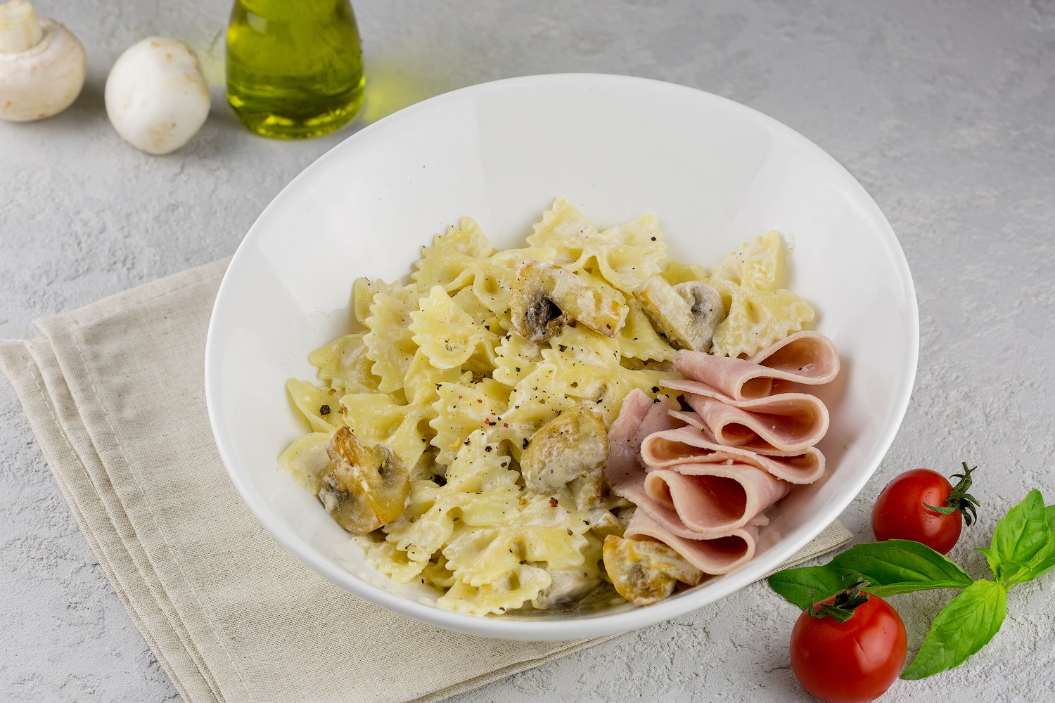 Макароны с ветчиной и грибами в сливочном соусе