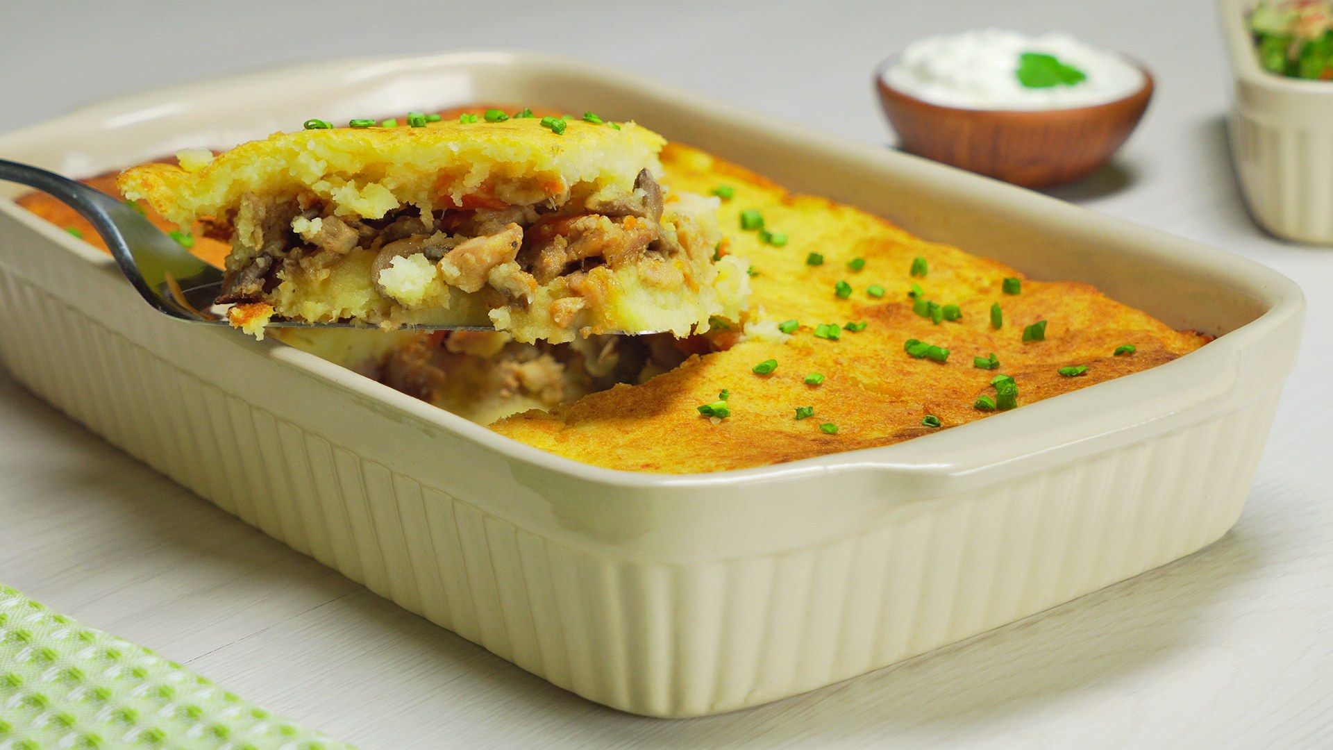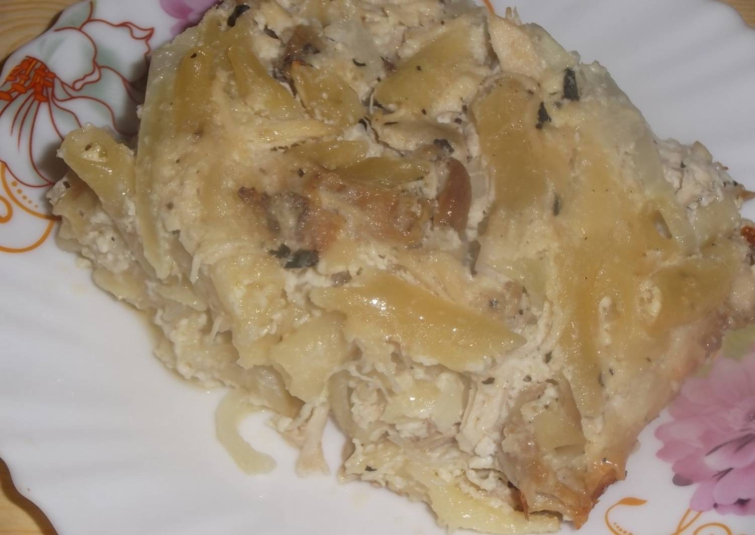 Запеканка с пюре курицей и грибами