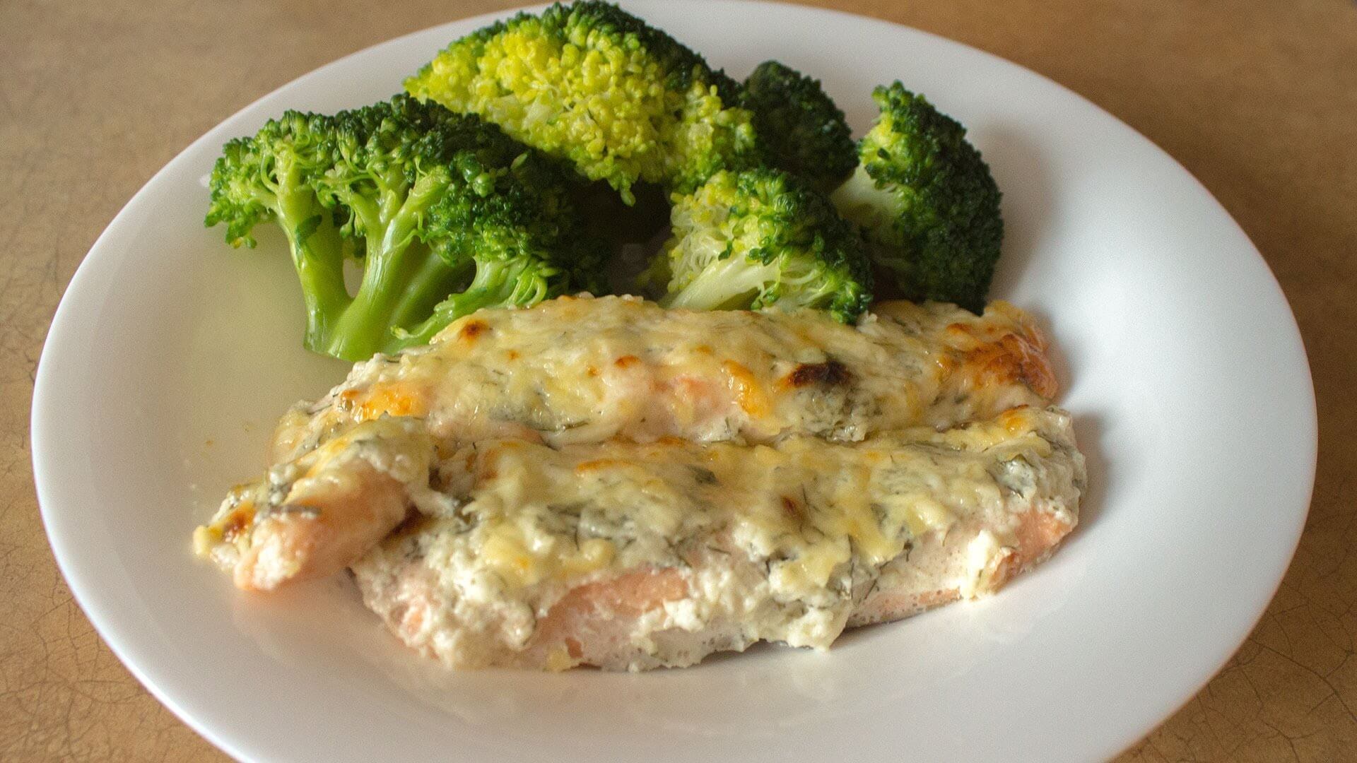 Горбуша с брокколи, запеченные в сливках