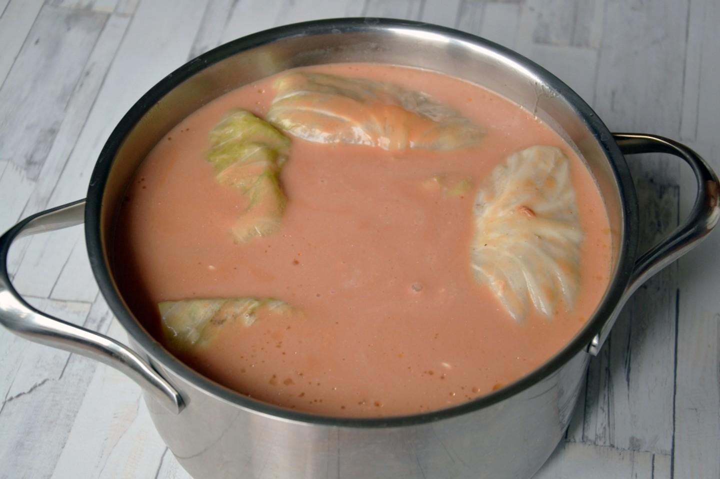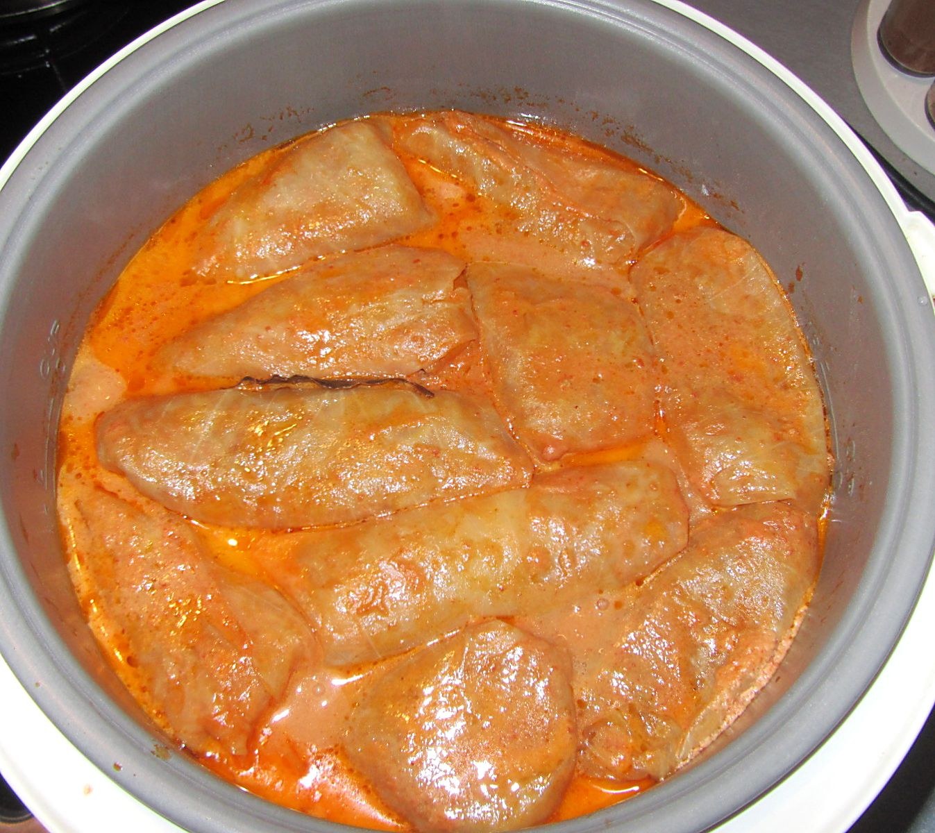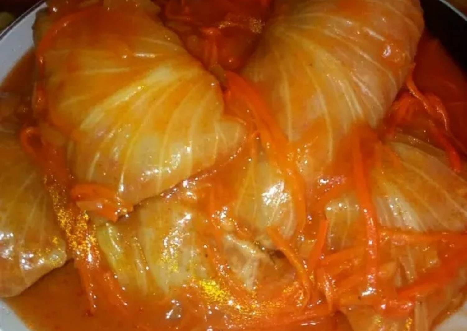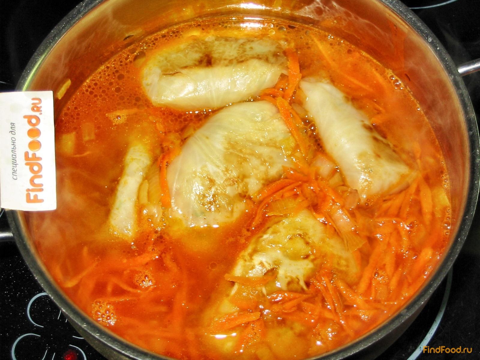 Голубцы из свежей капусты в кастрюле с томатной пастой и морковью