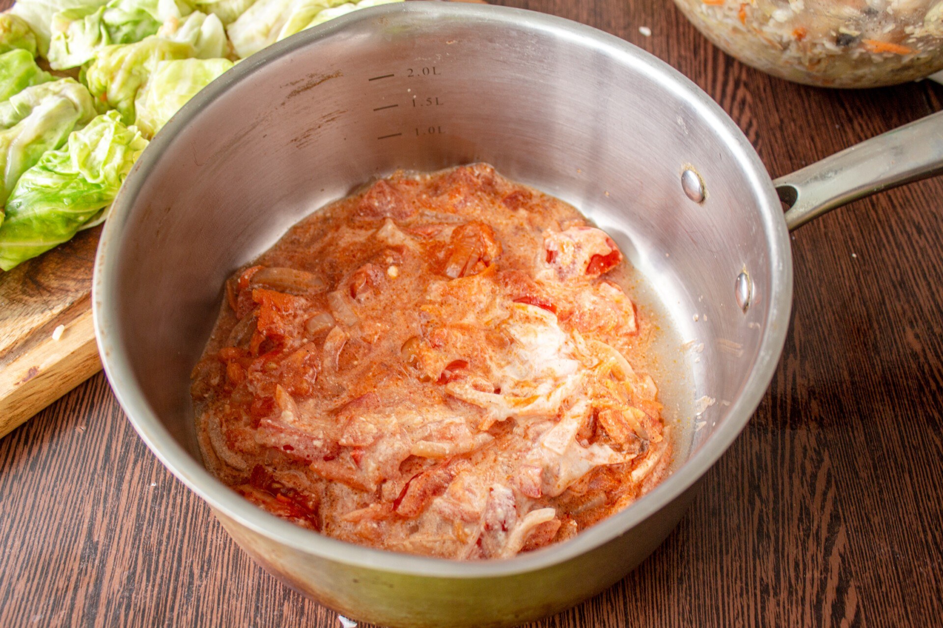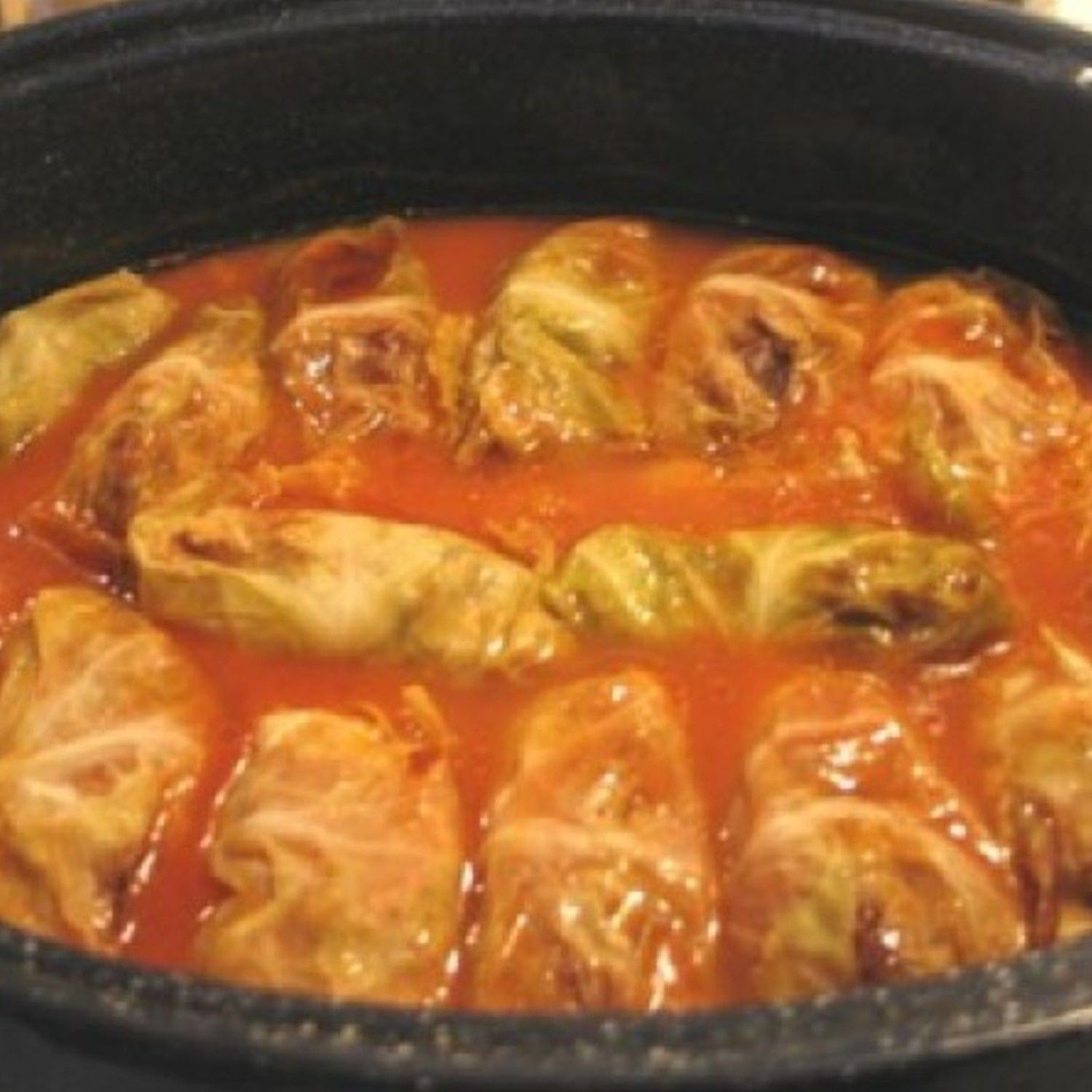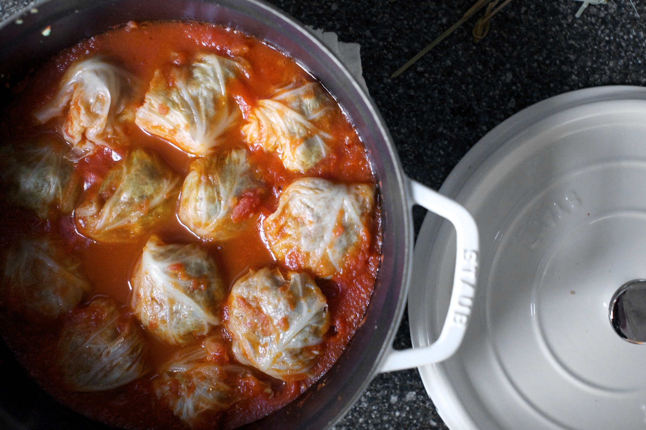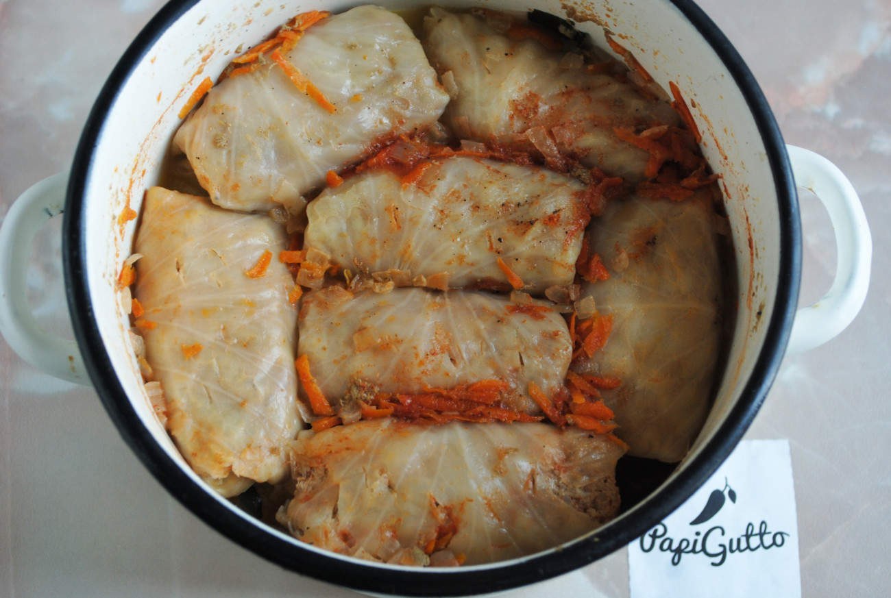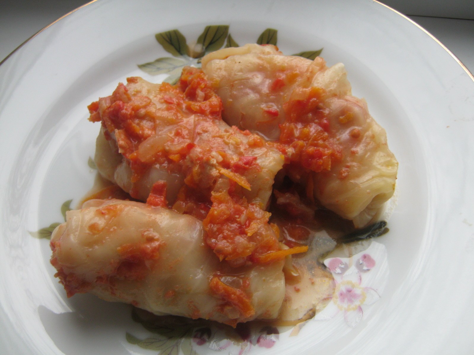 Голубцы из свежей капусты в кастрюле с томатной пастой и морковью