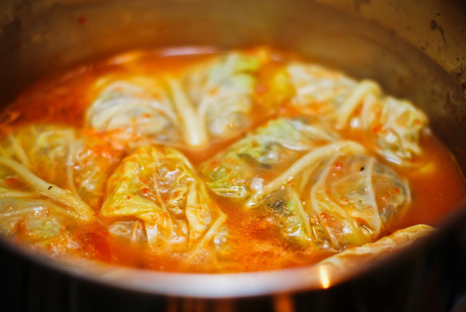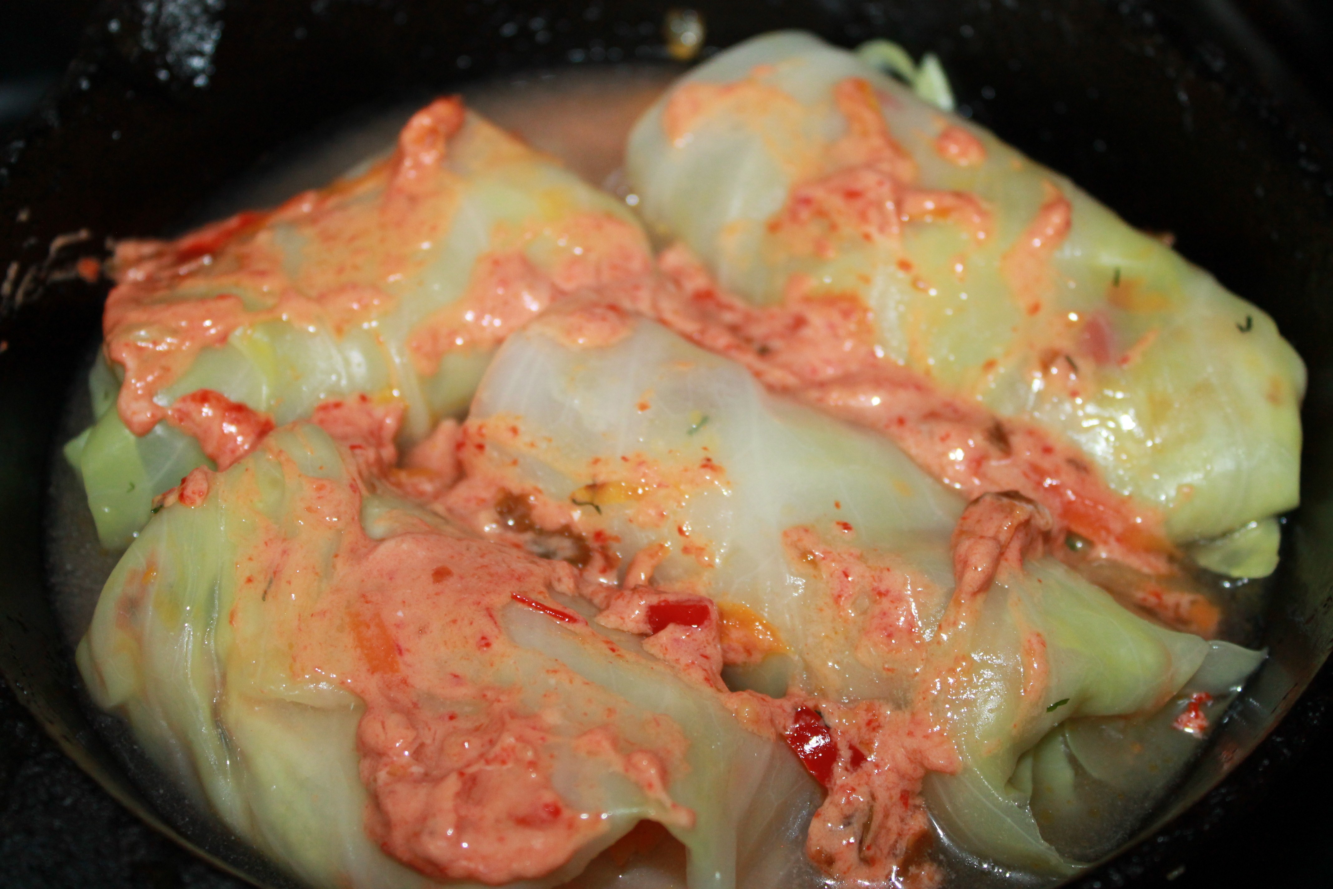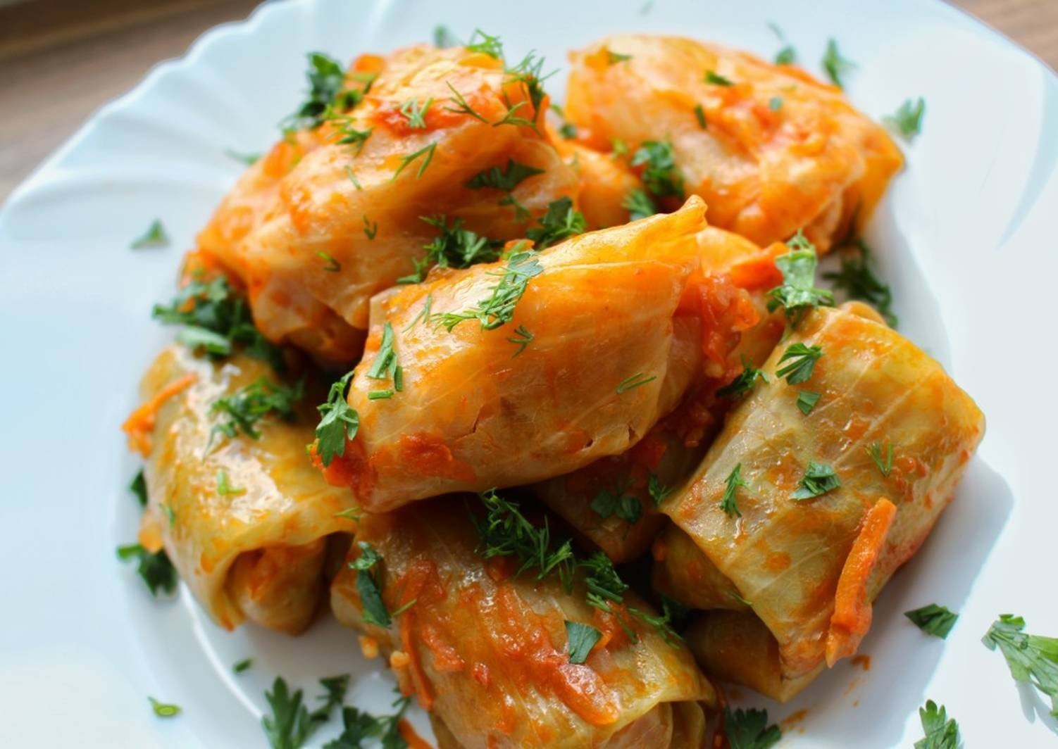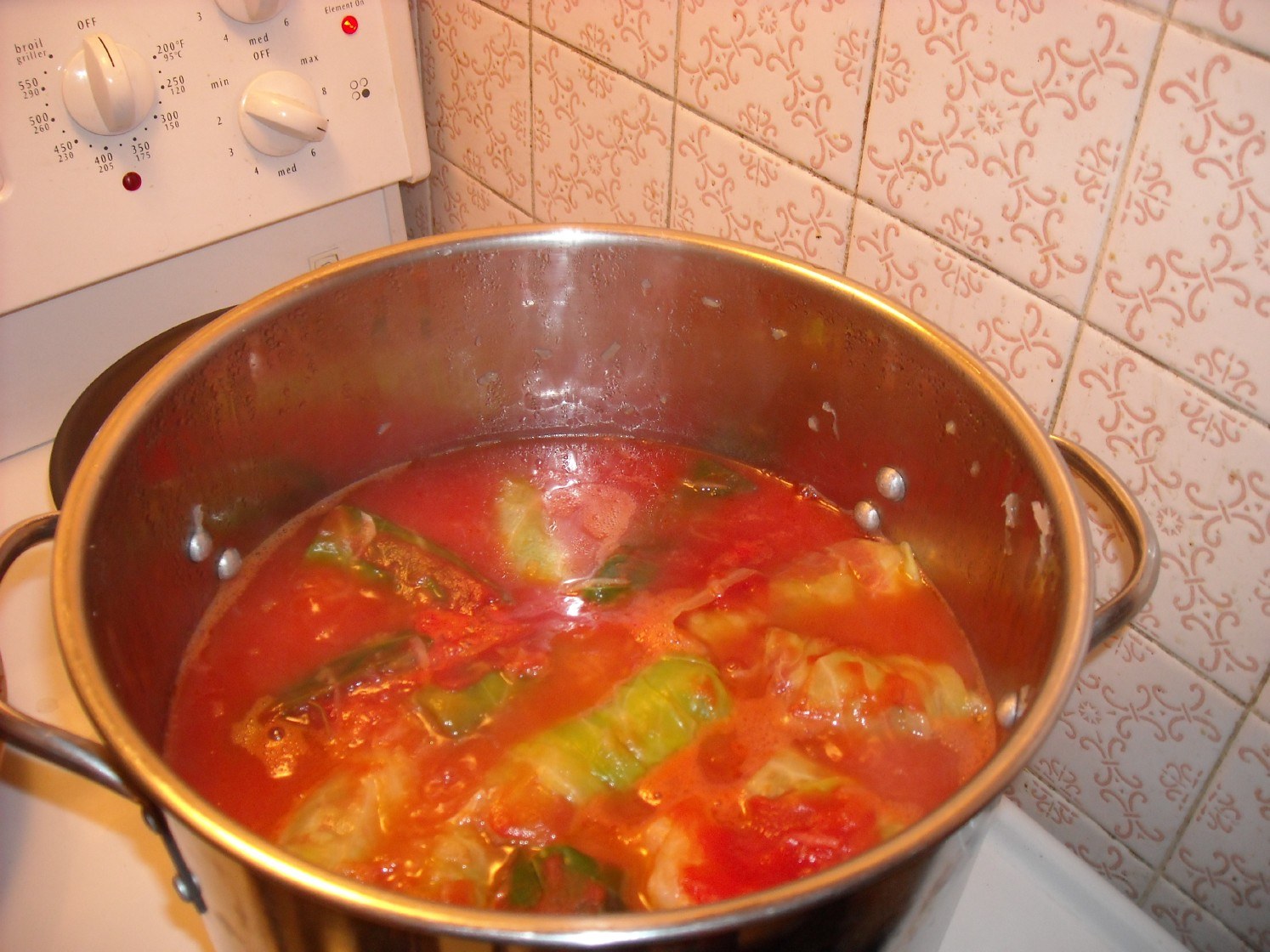 Голубцы из свежей капусты в кастрюле с томатной пастой и морковью