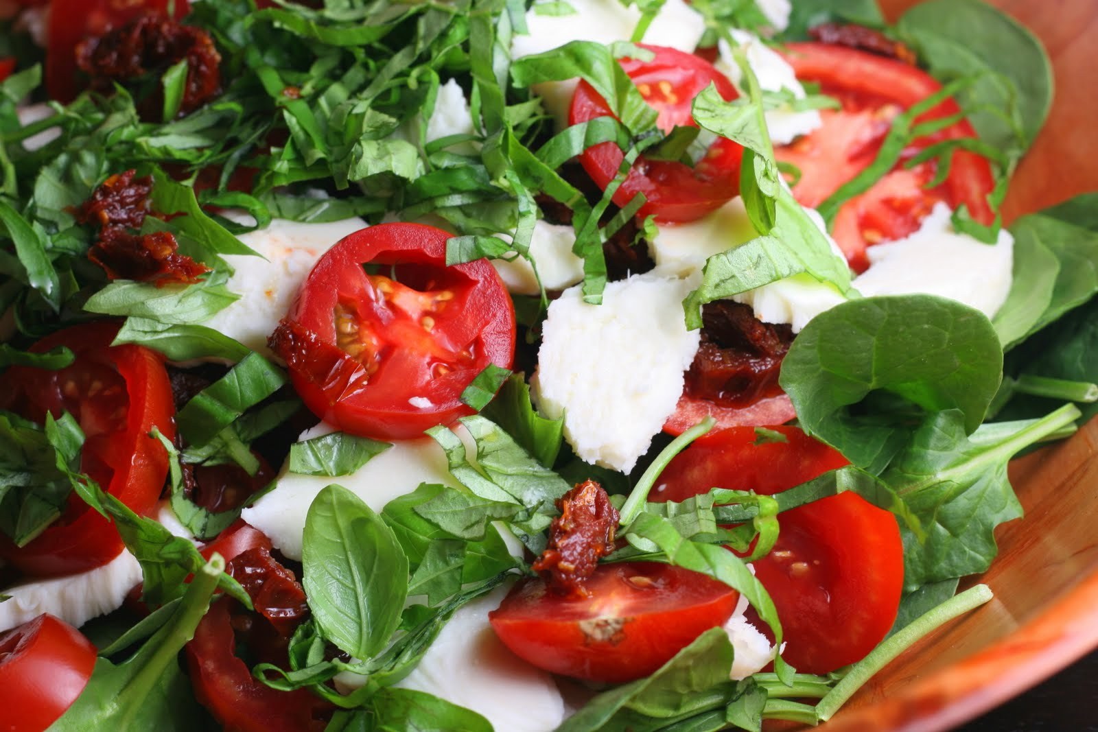 Салат с вялеными помидорами и моцареллой и курицей
