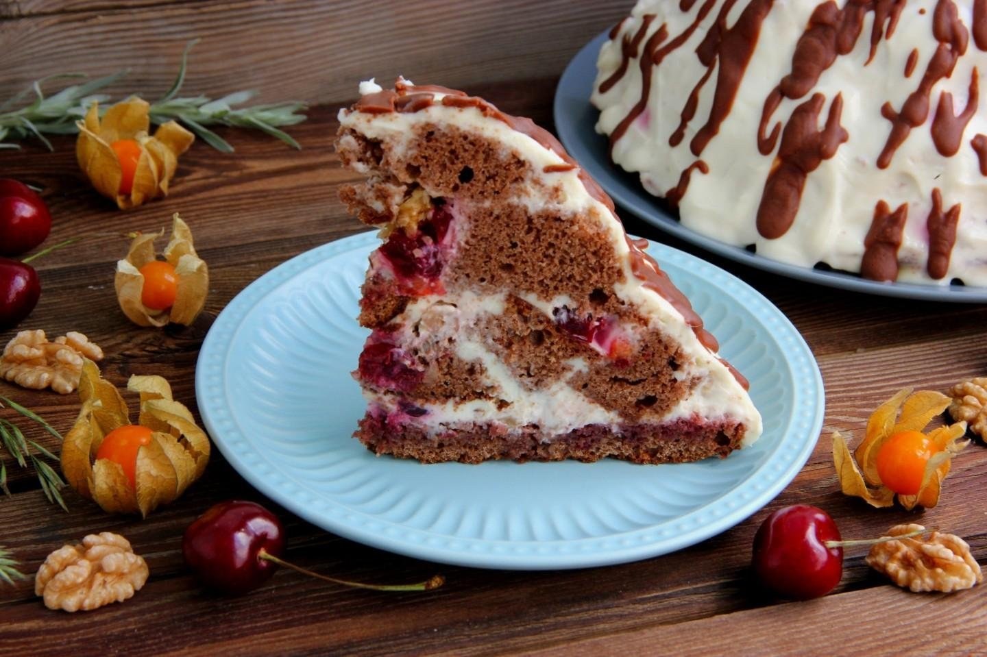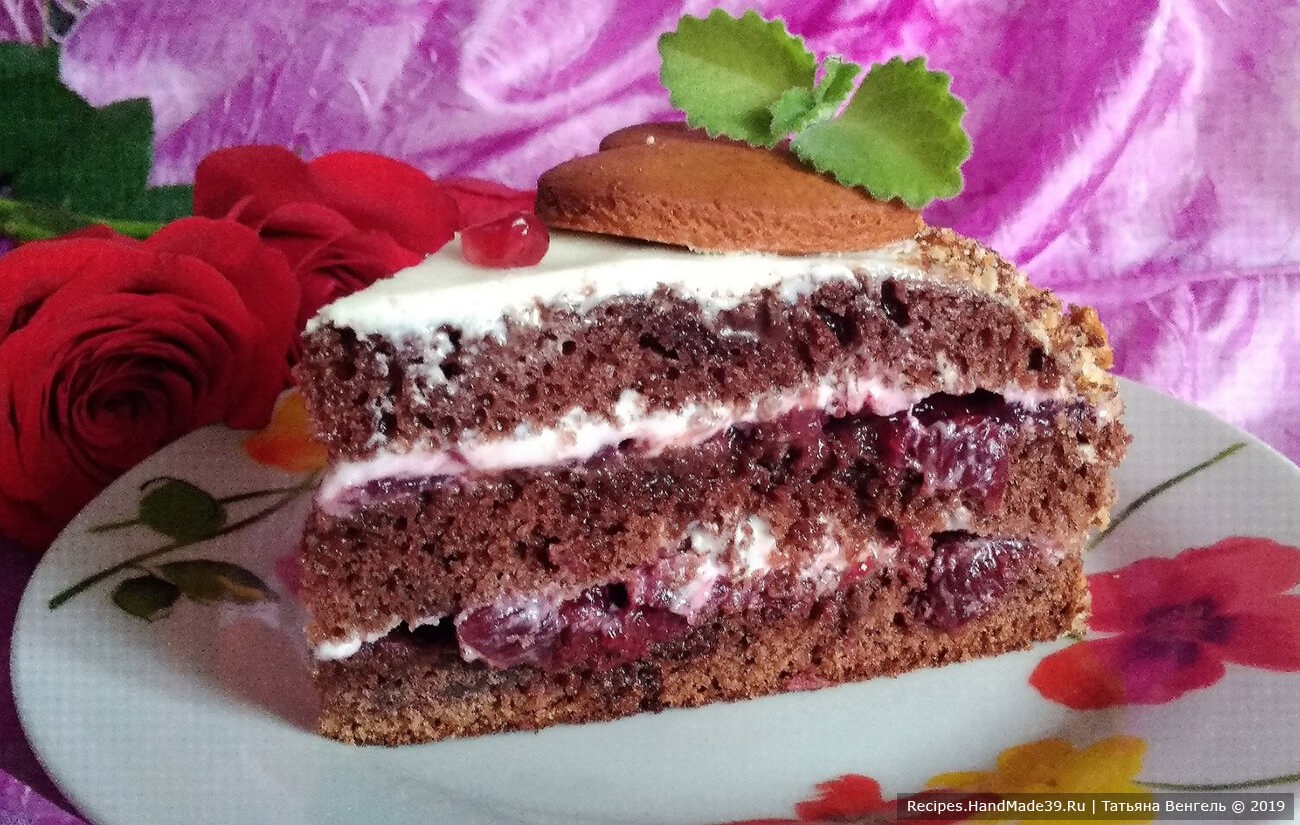 Торт шоколадный с вишней и творожным кремом