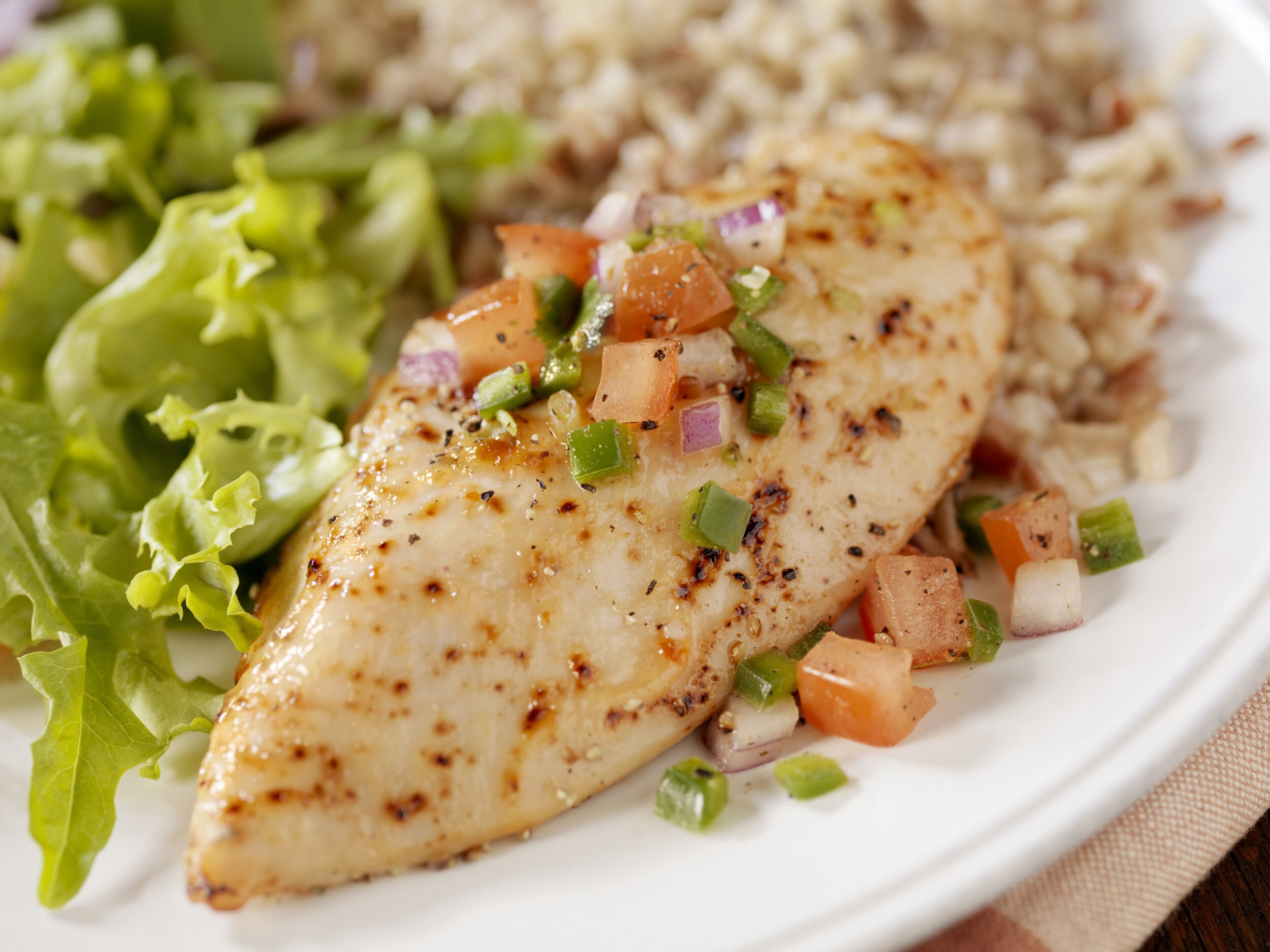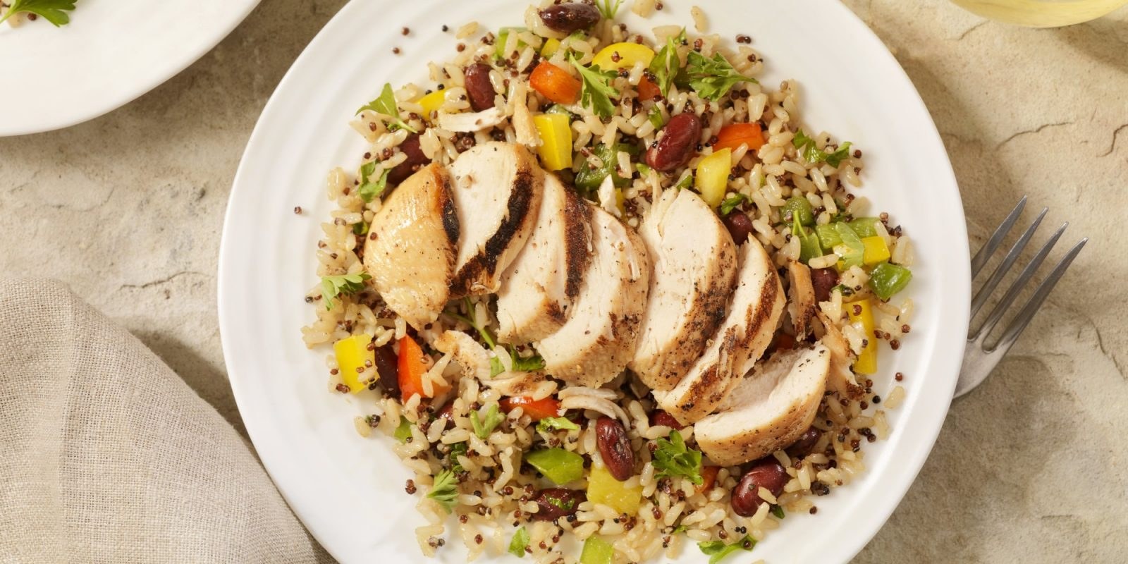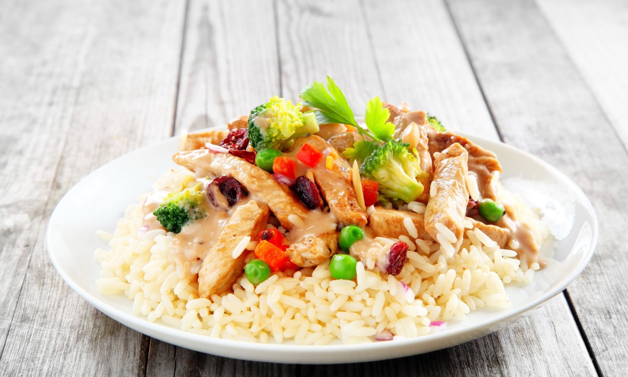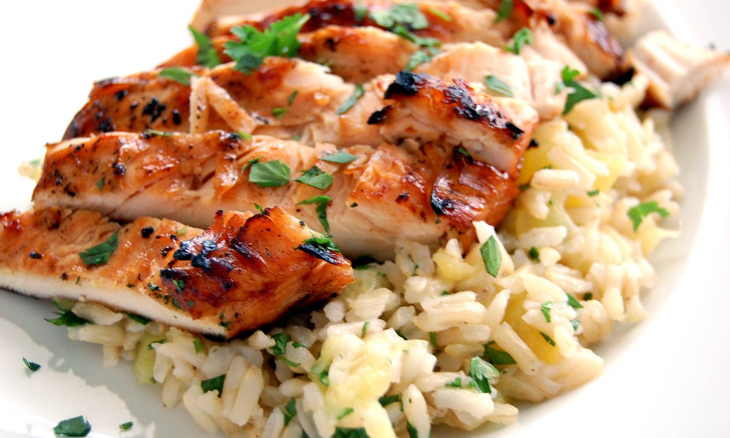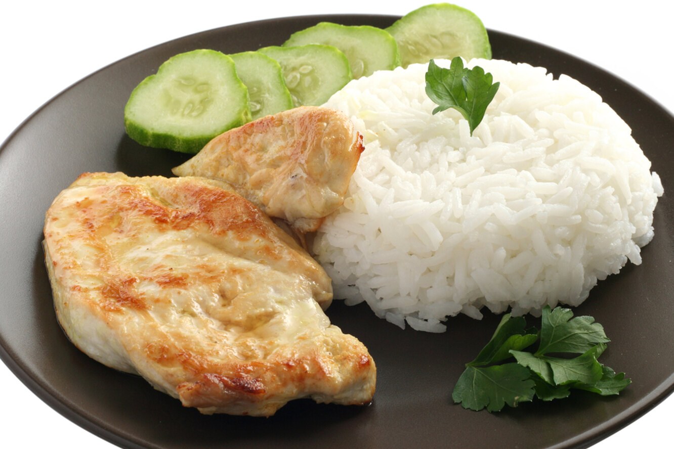 Куриная грудка с рисом в белой тарелке
