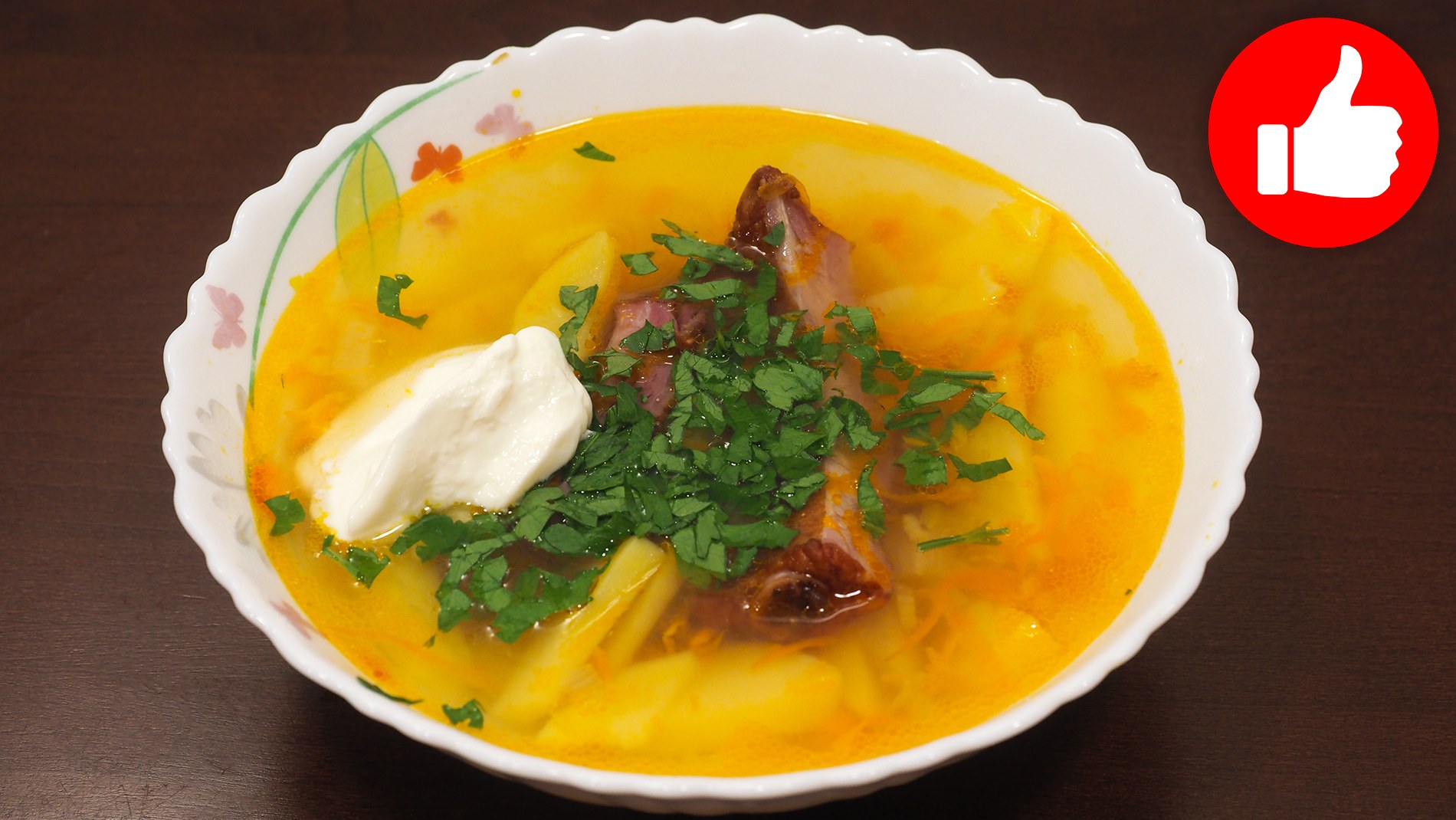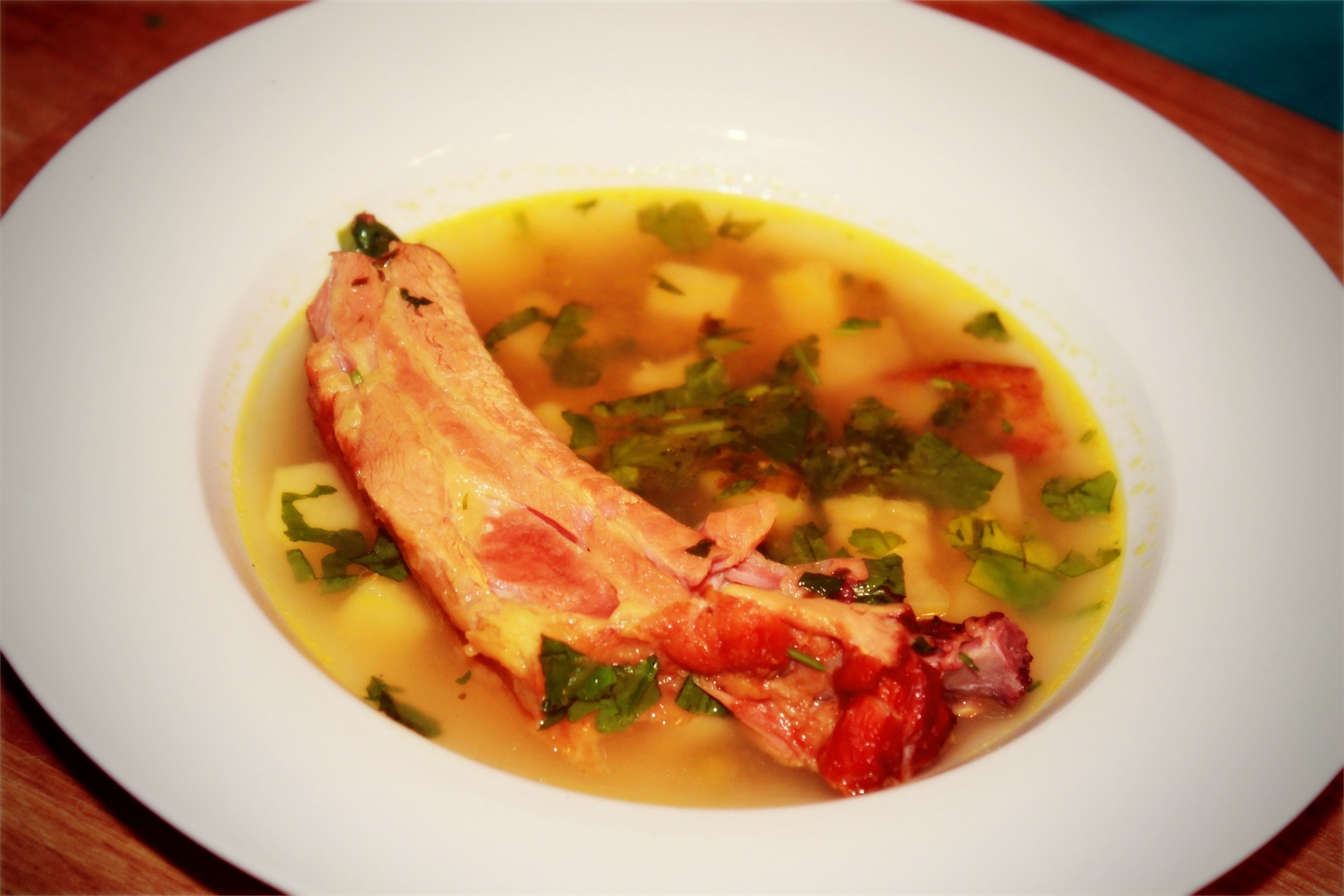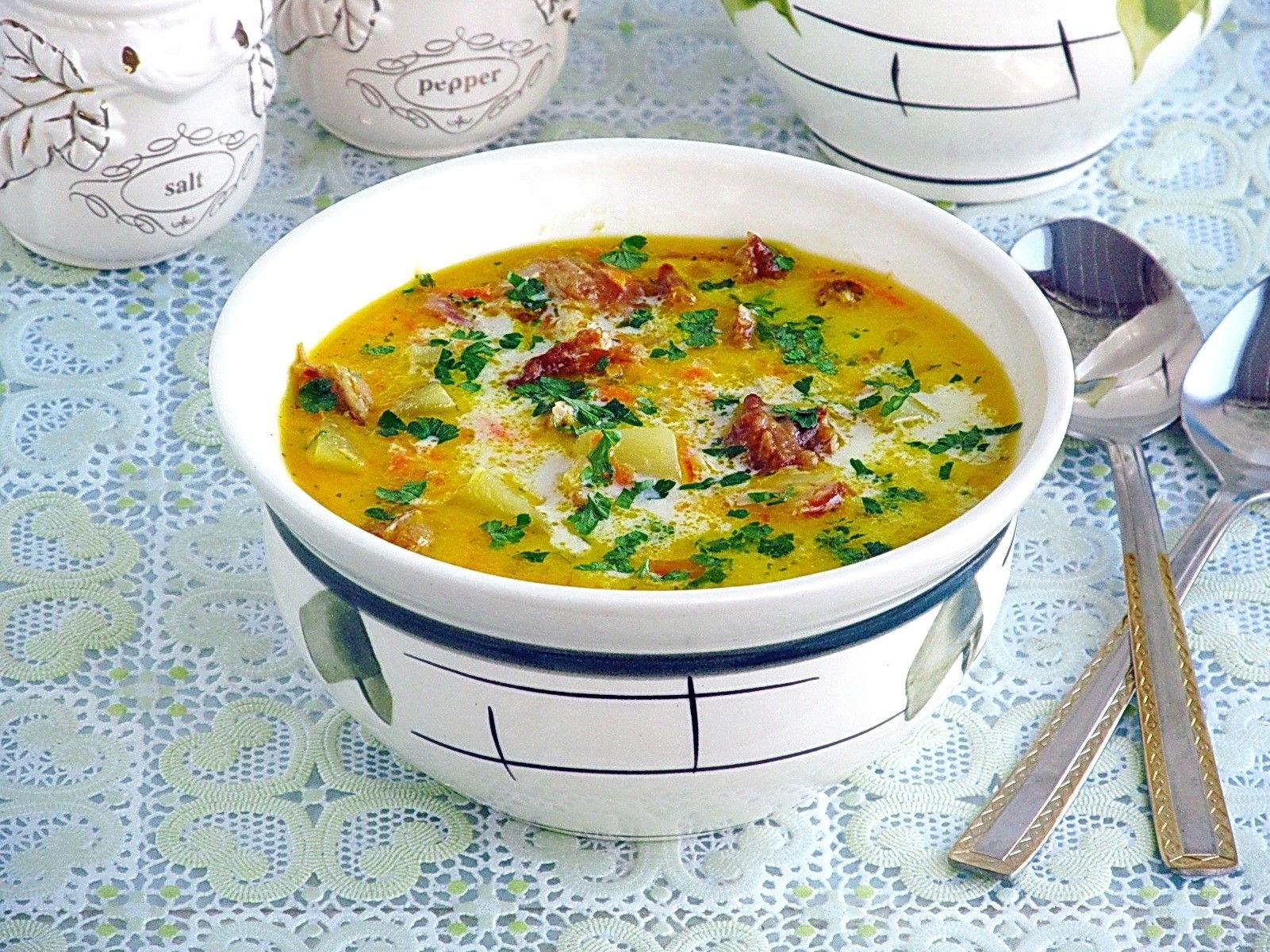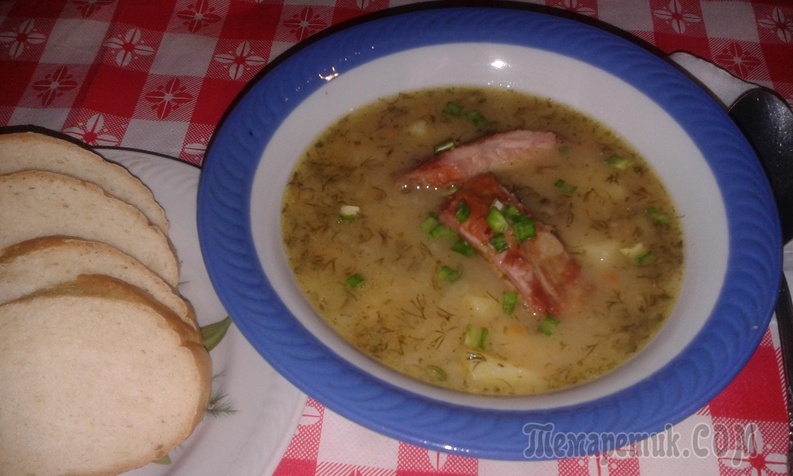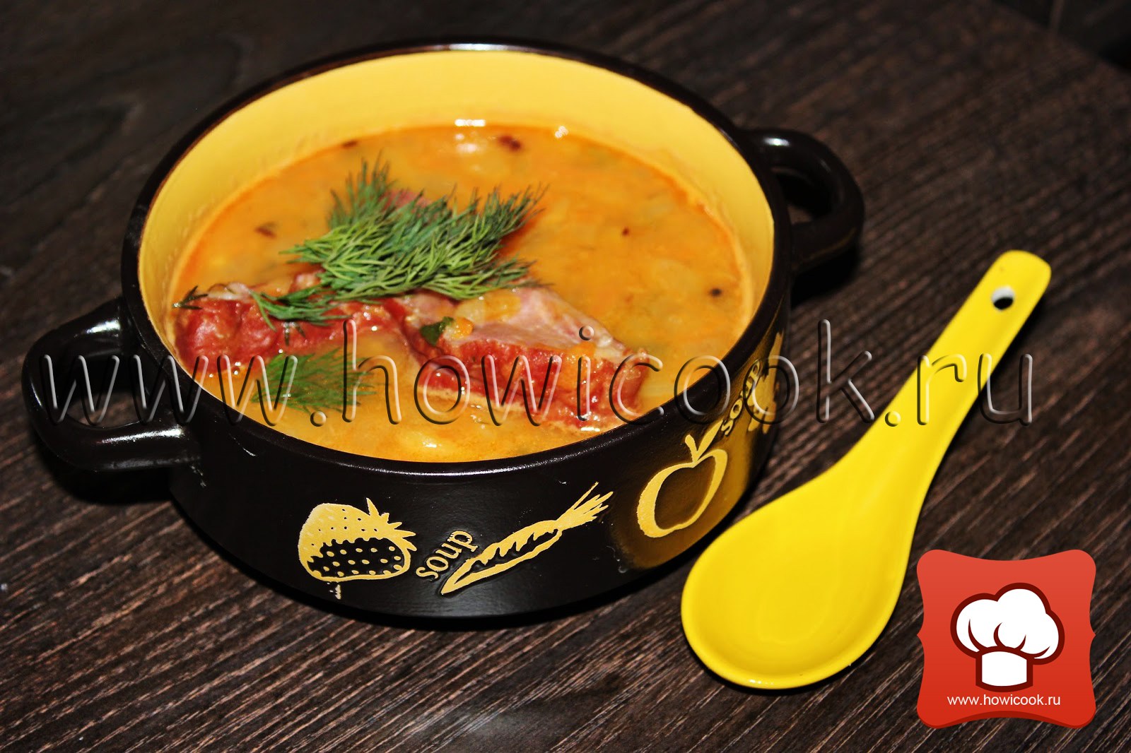 Сырный суп с копчеными ребрышками шампиньонами и черри