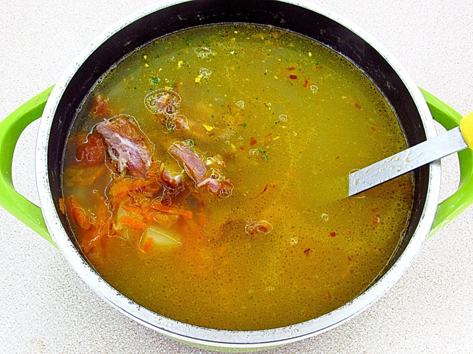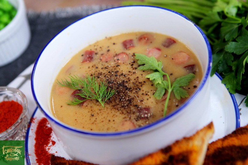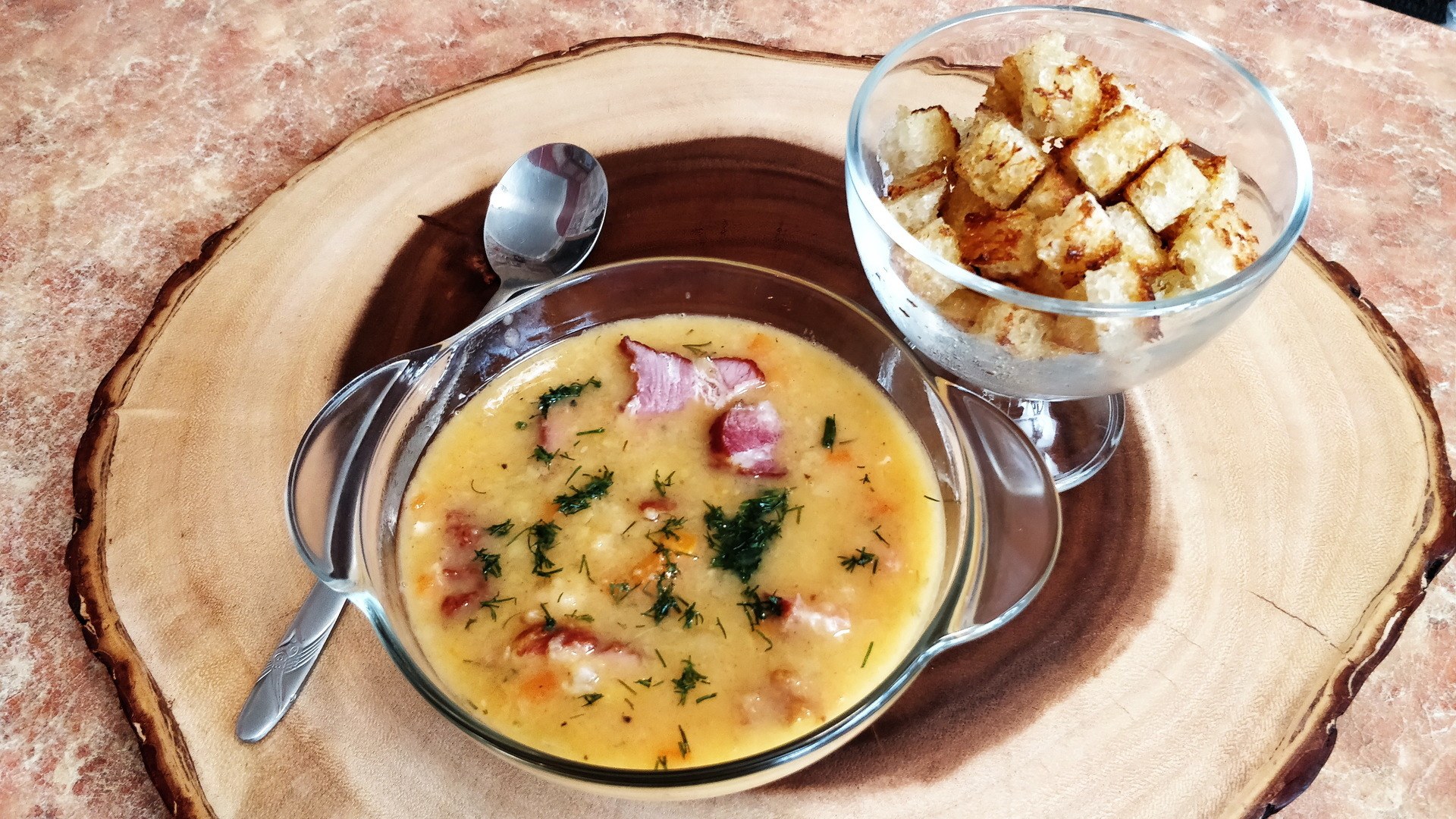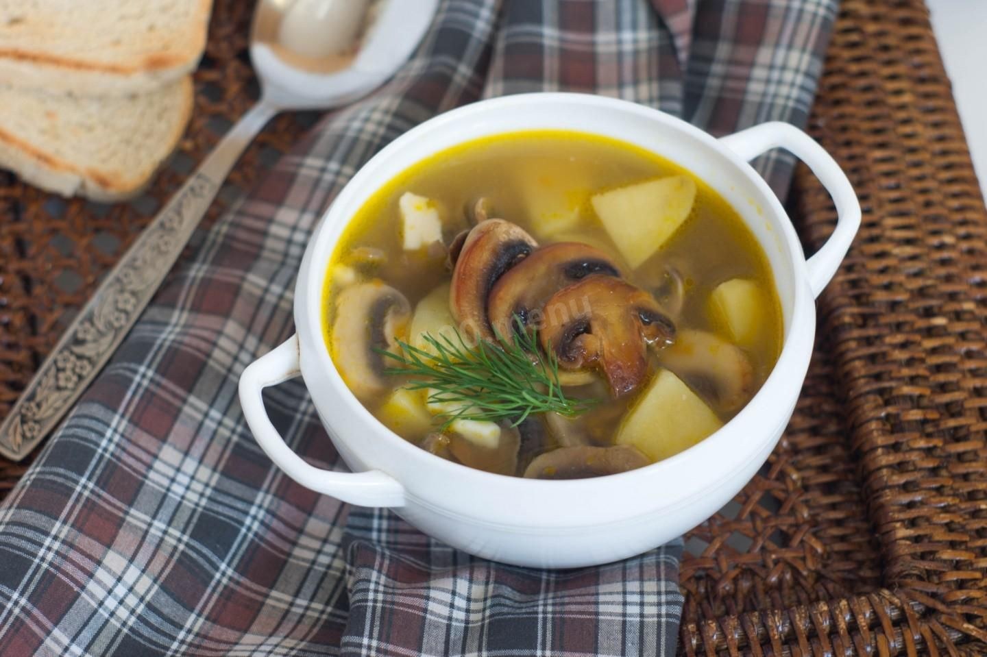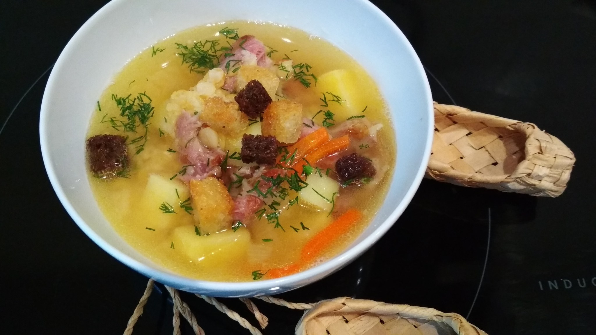 Сырный суп с копчеными ребрышками шампиньонами и черри