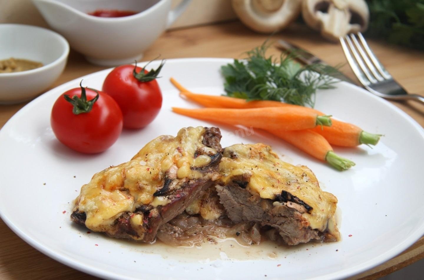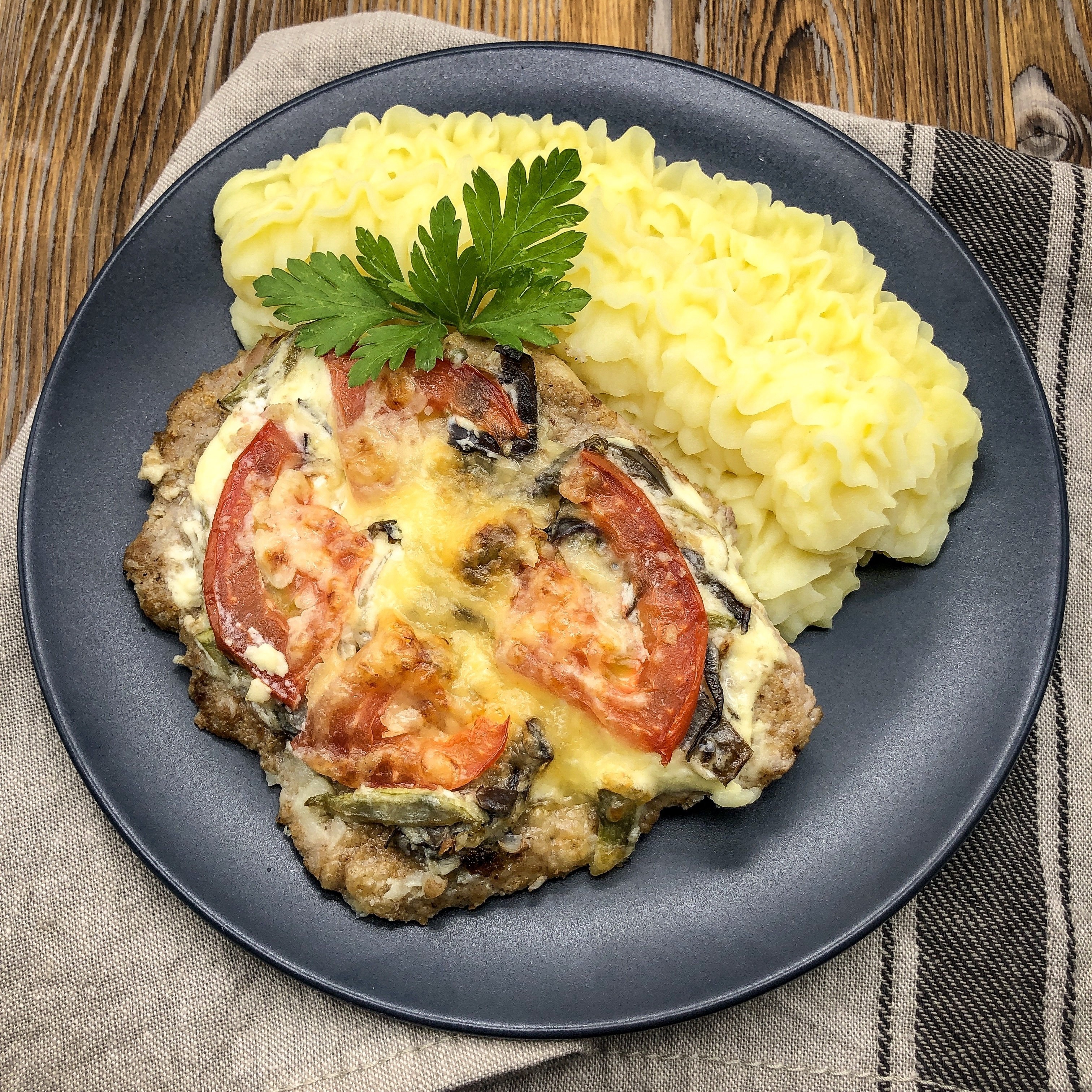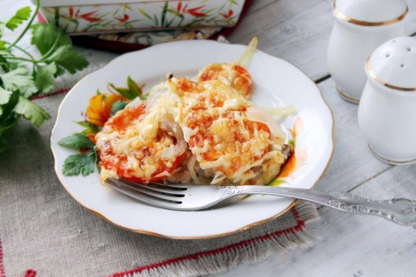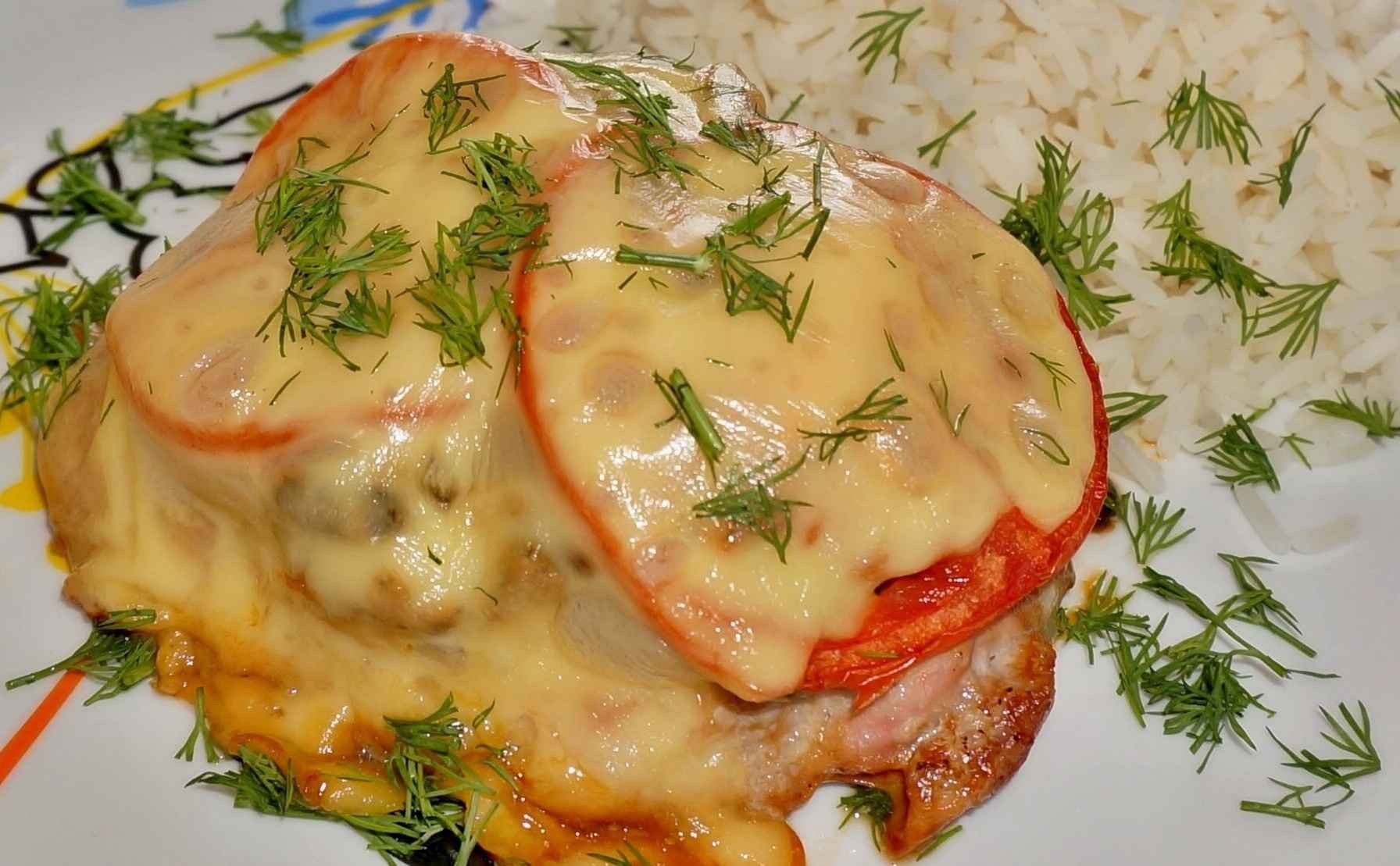 Отбивные из свинины в духовке с помидорами и сыром и грибами