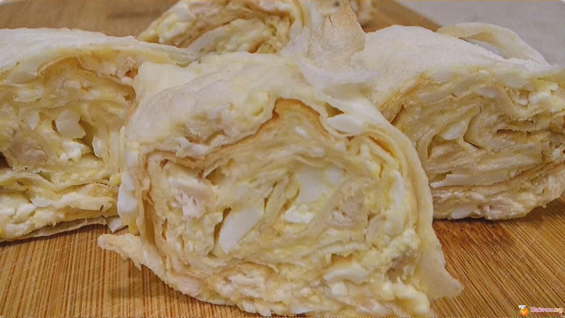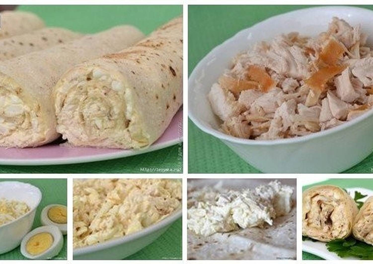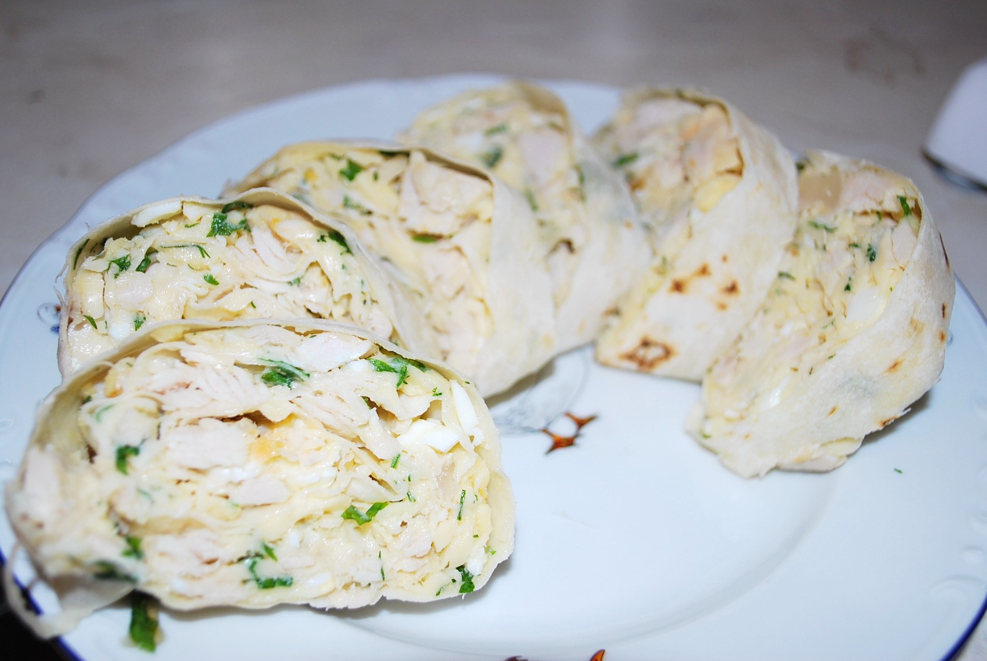 Рулет из лаваша с курицей и сыром и яйцом и зеленью