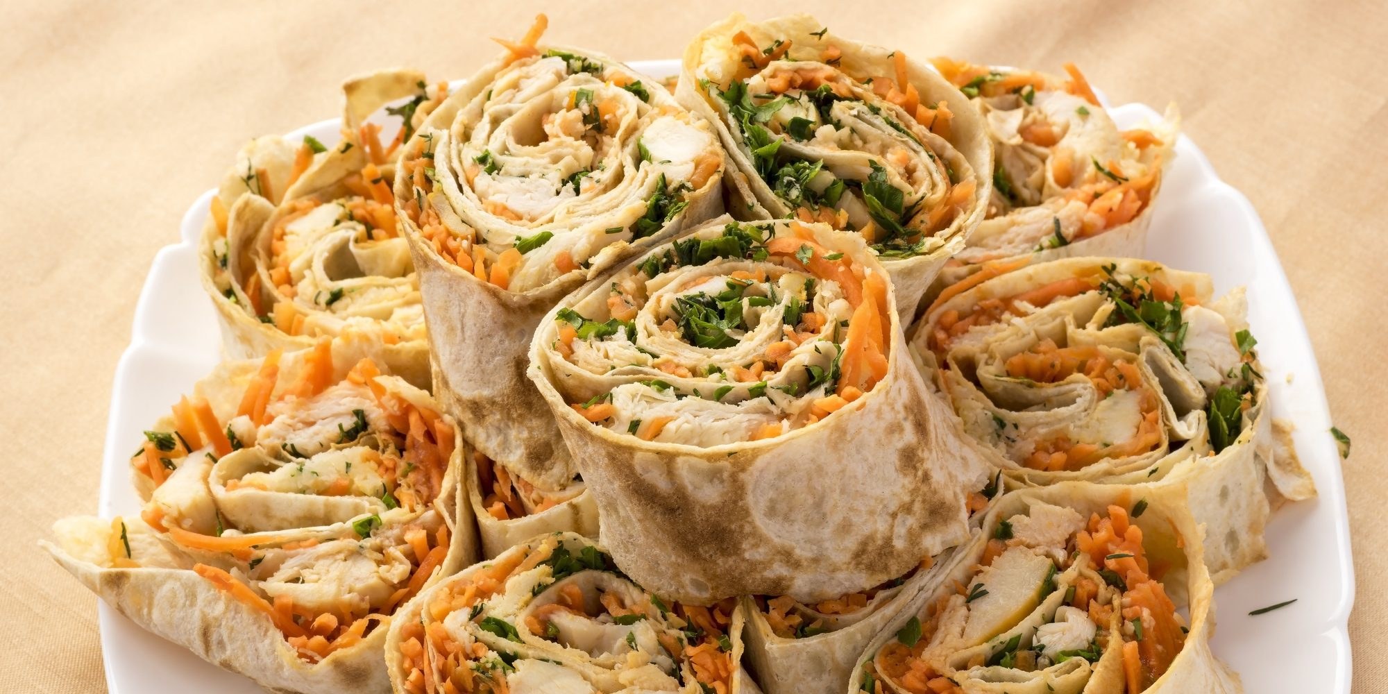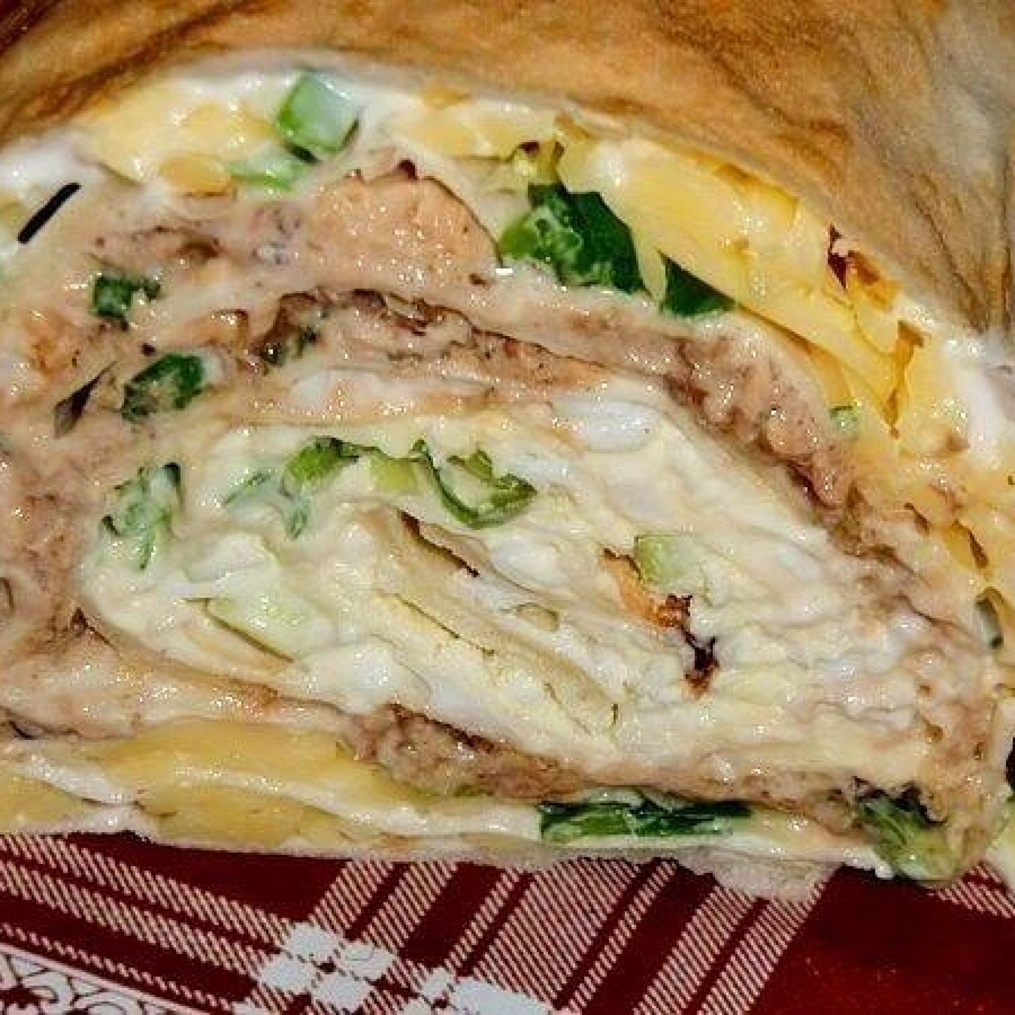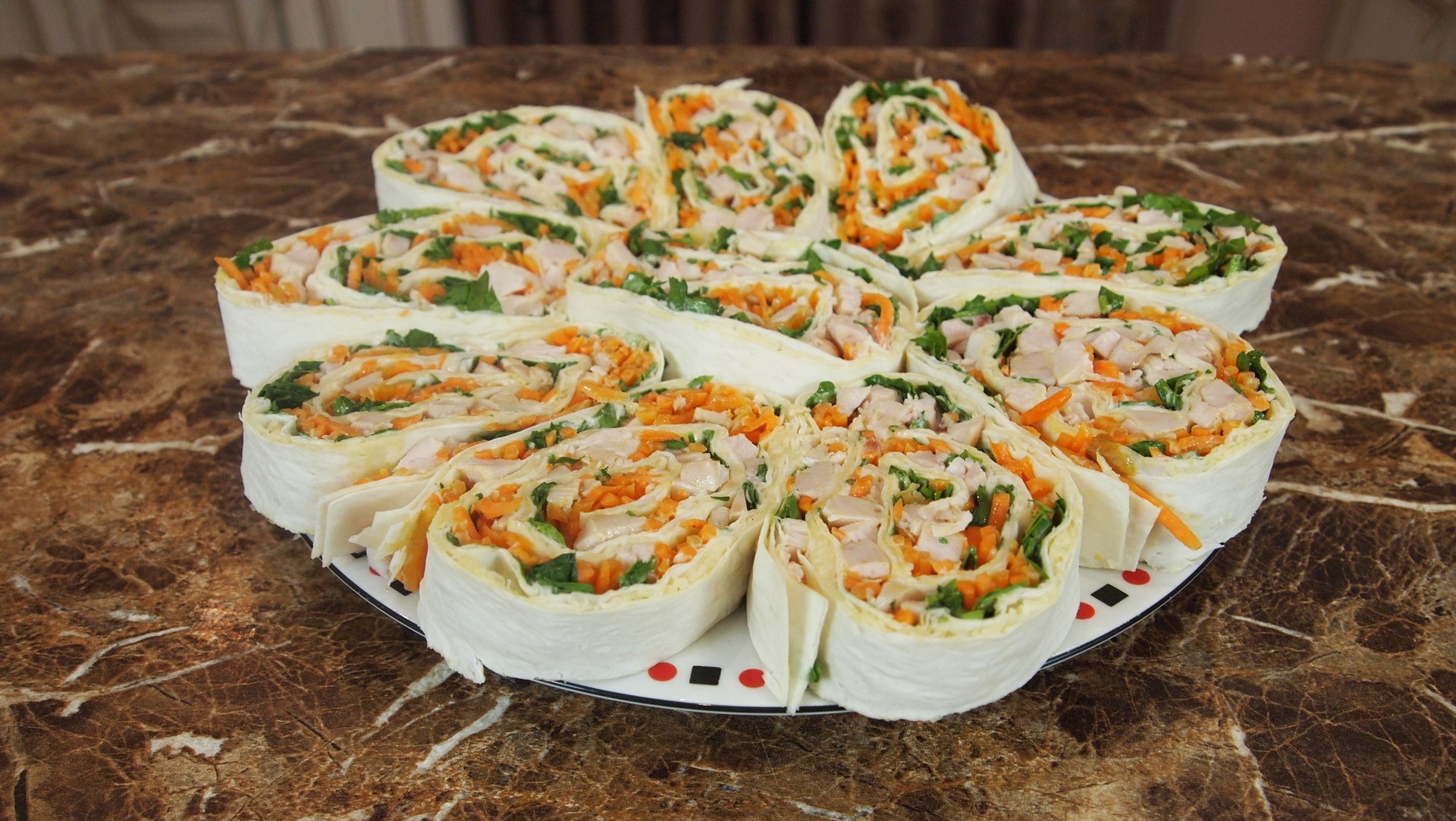 Рулет из лаваша с курицей и сыром и яйцом и зеленью
