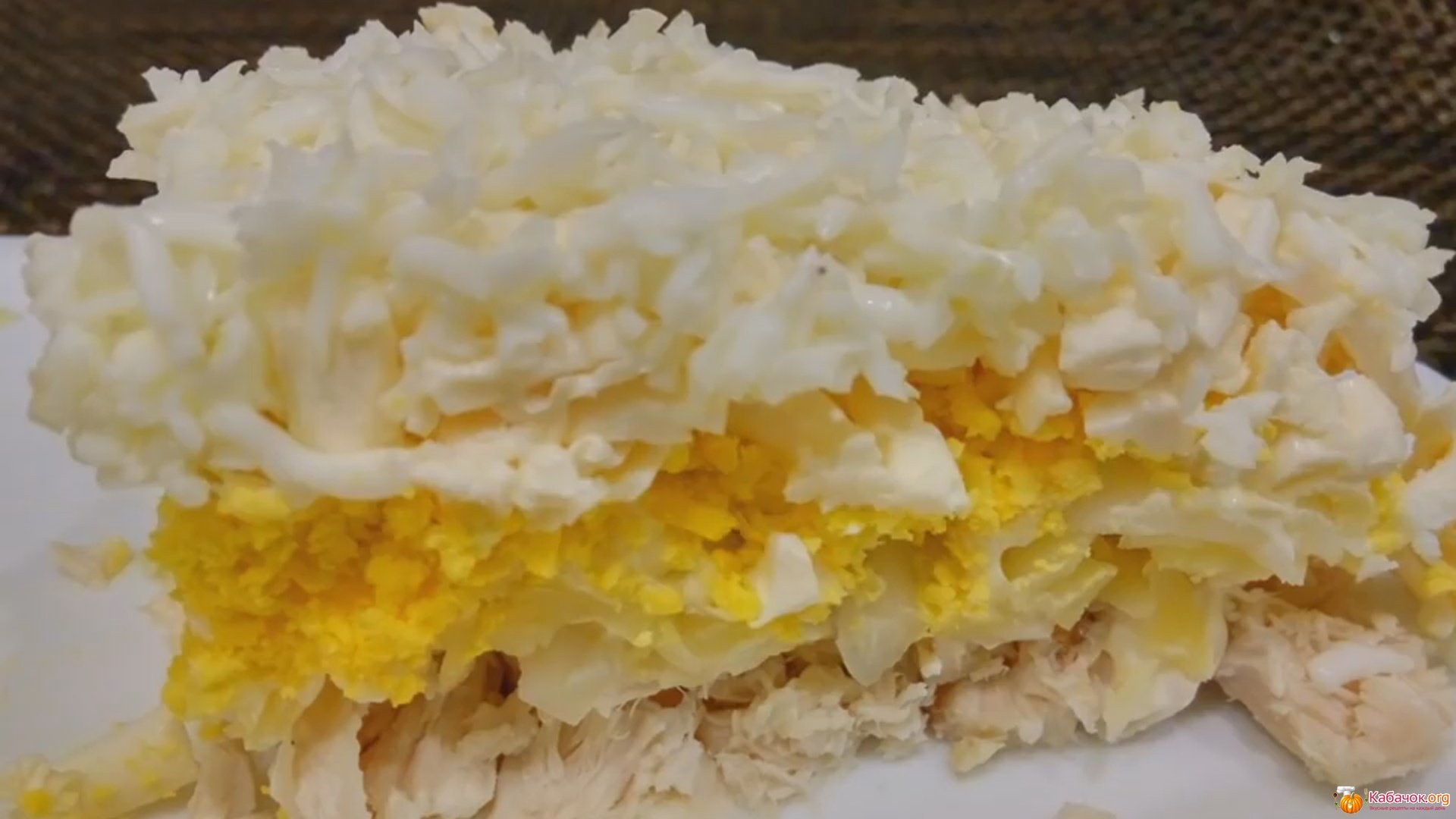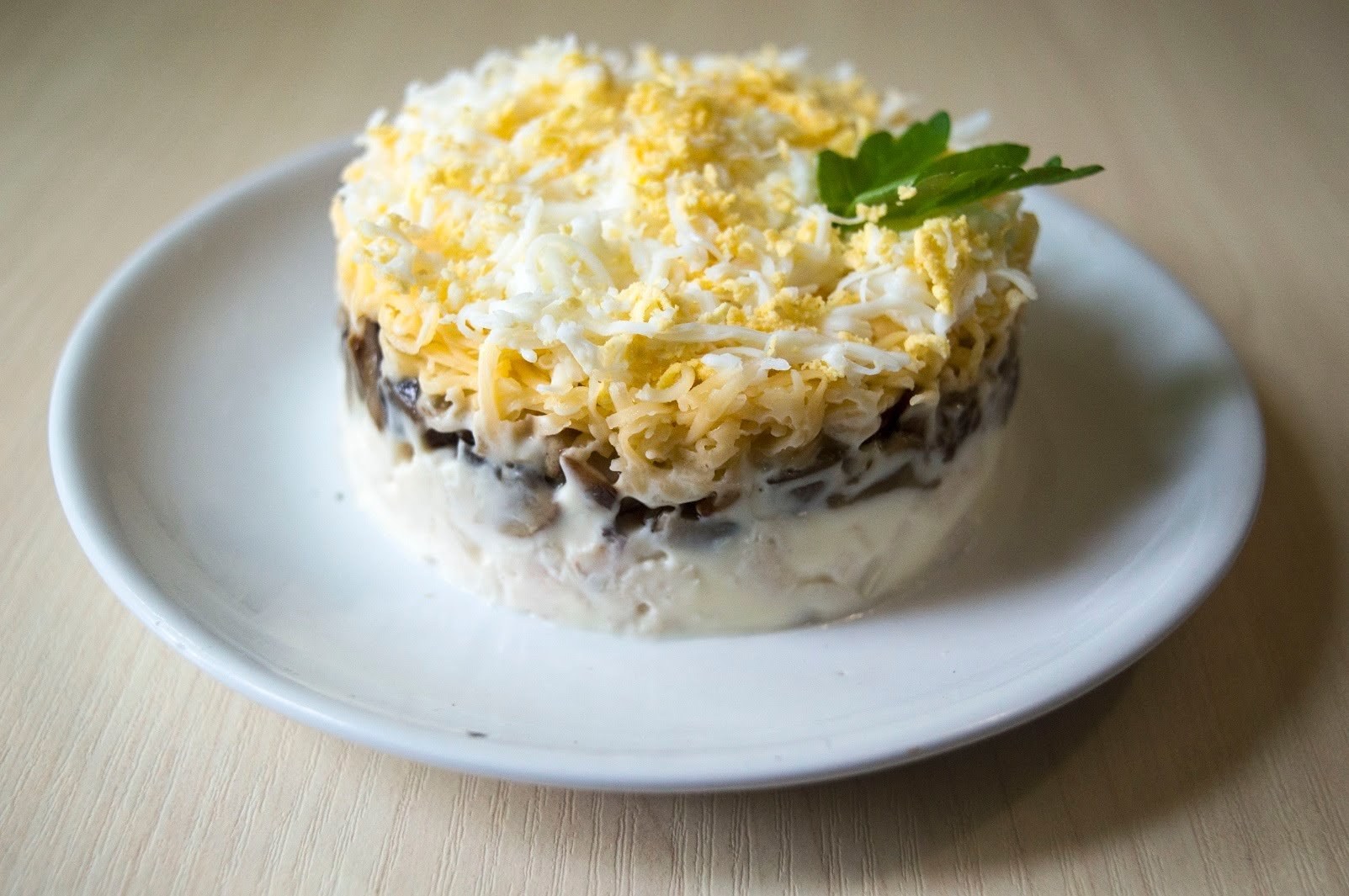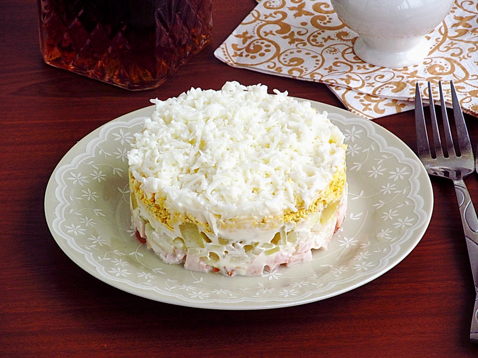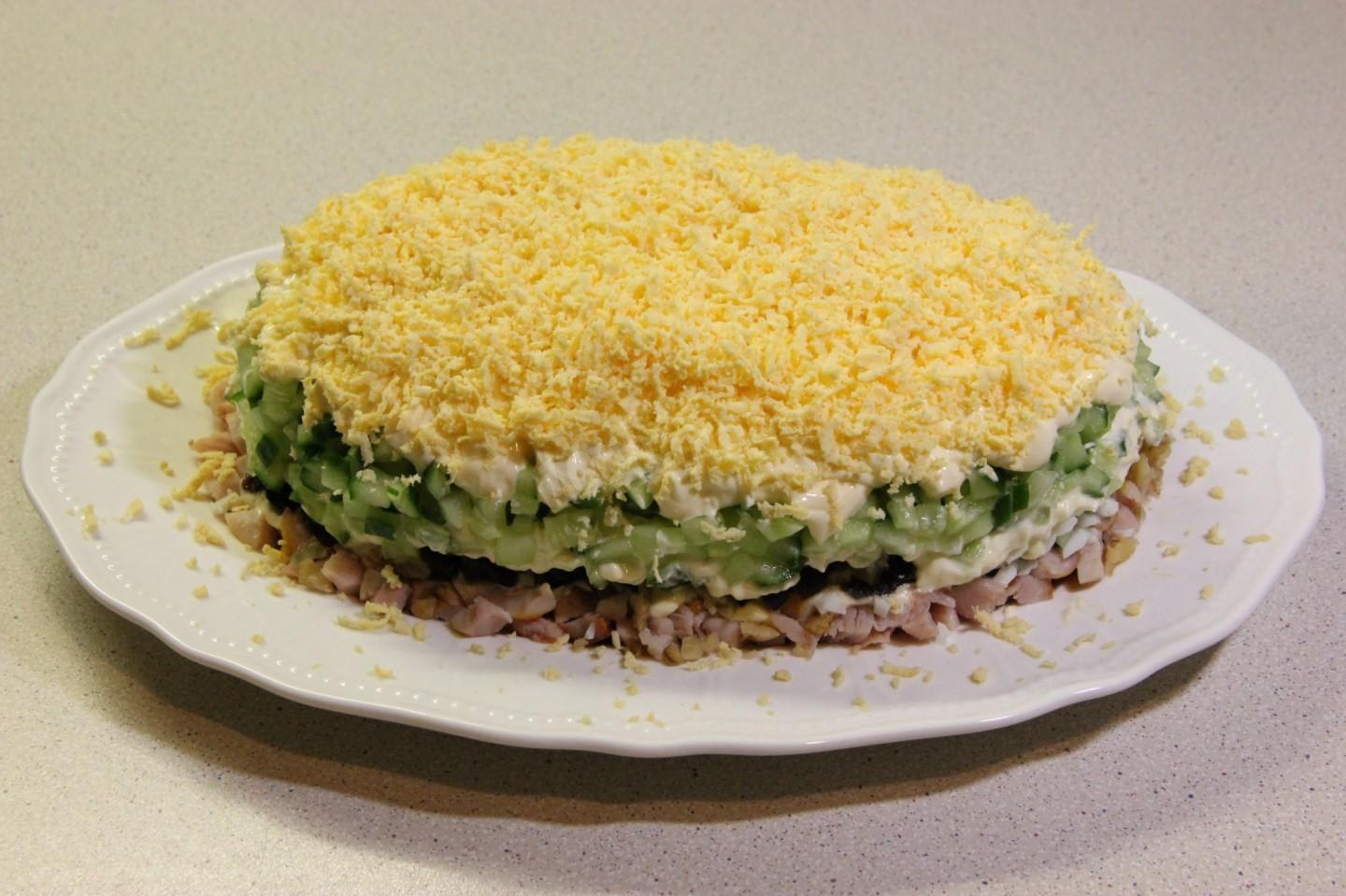 Слоеный салат с копченой курицей черносливом грецкими орехами