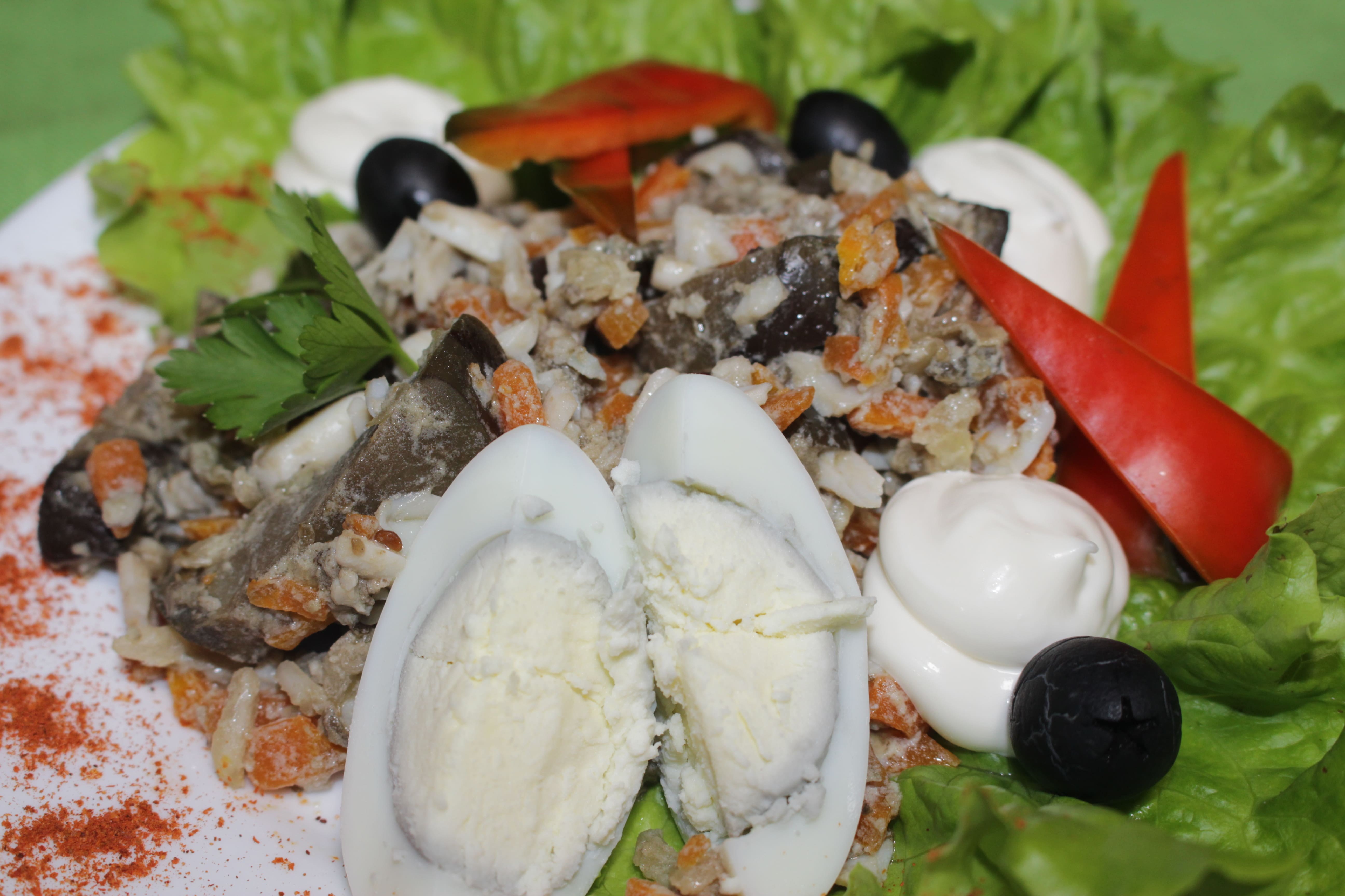 Салат из баклажан с яйцом и жареным луком с майонезом