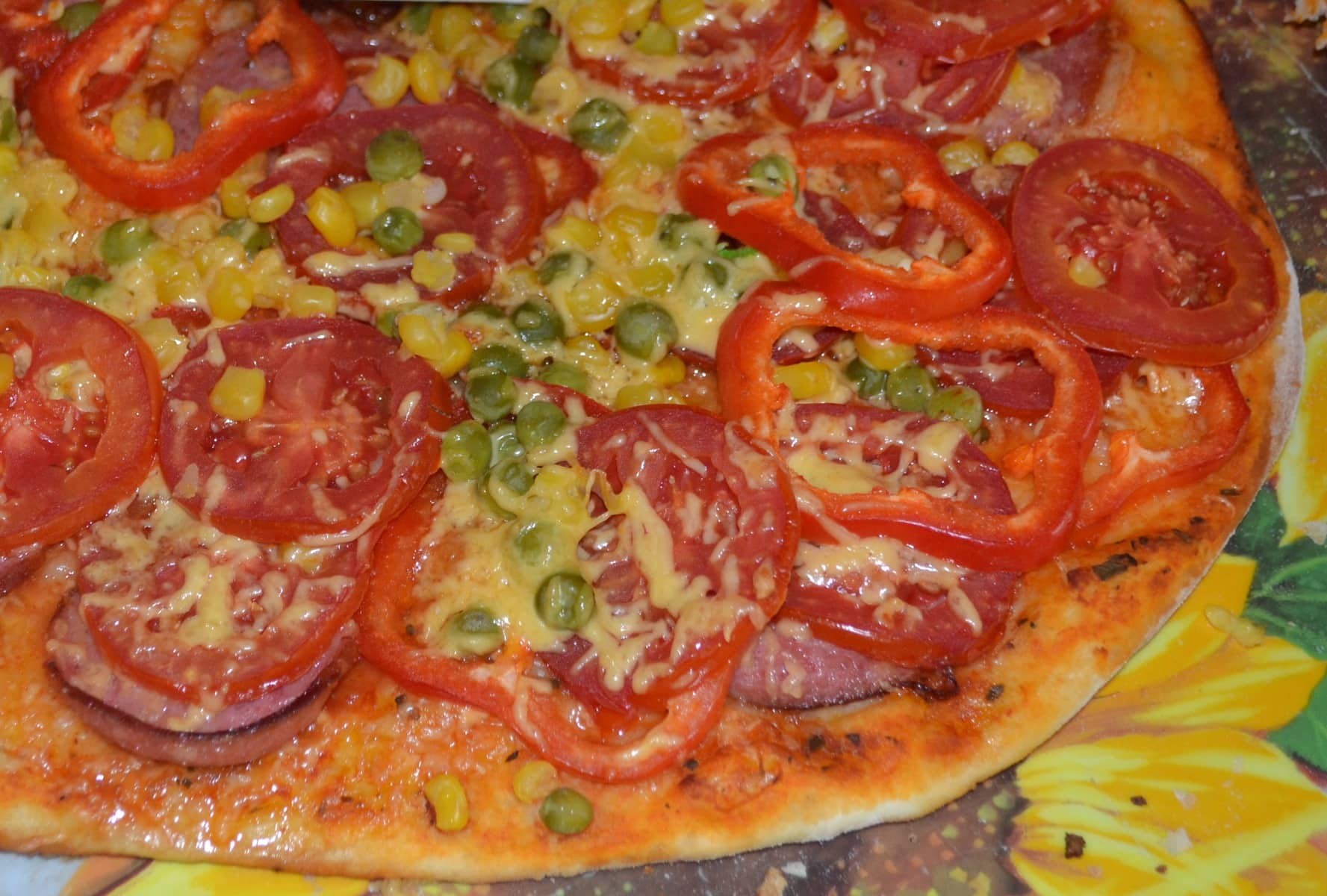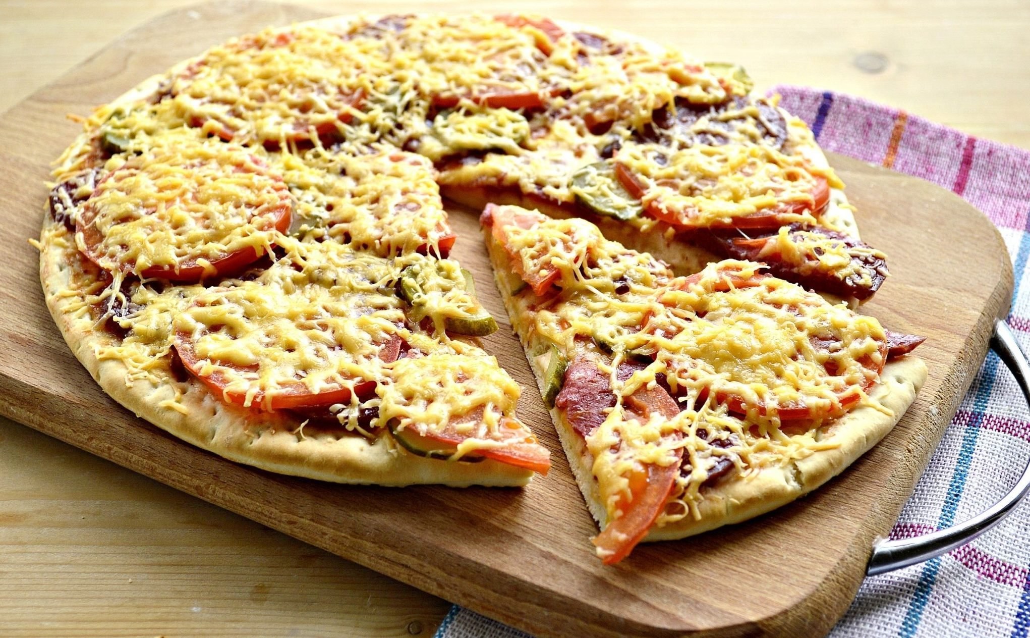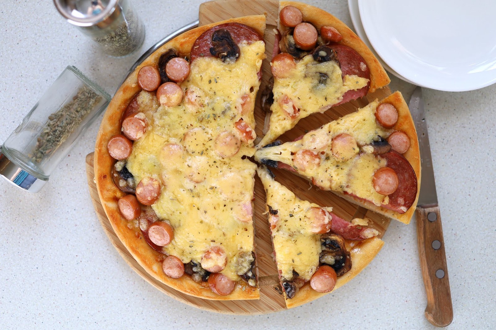 Домашняя пицца с колбасой и сыром
