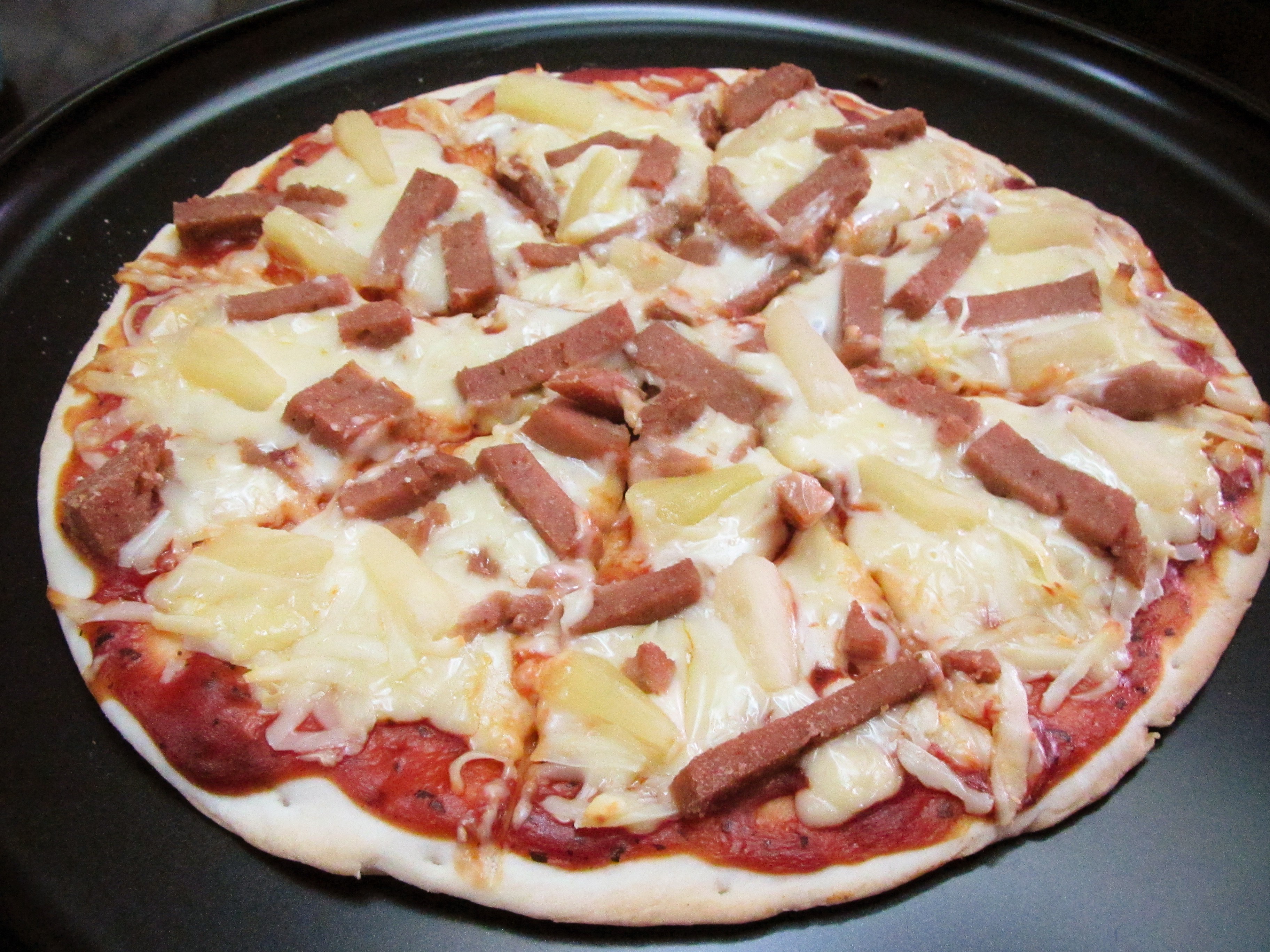 Пицца с ананасами и колбасой