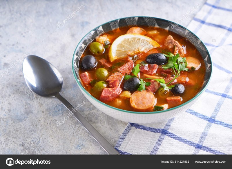 Суп с маслинами и копченой колбасой