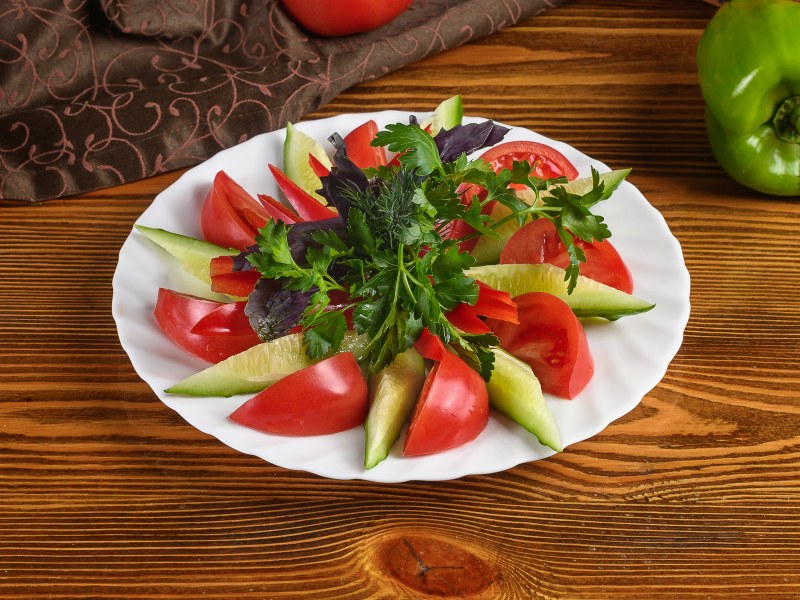 Ассорти овощное. (Помидор, огурец, болгарский перец, маслины, зелень.)