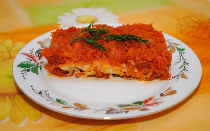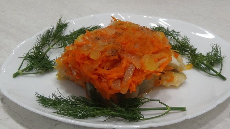 Хек в духовке с морковью и луком