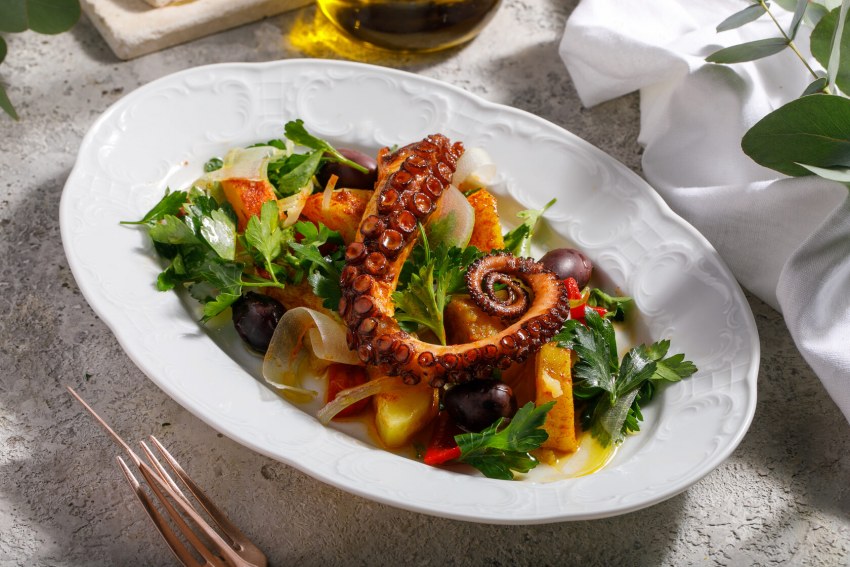 Осьминог с фисташковым хумусом и картофельными чипсами