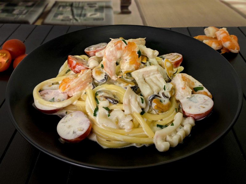 Черная паста с морепродуктами в сливочном соусе