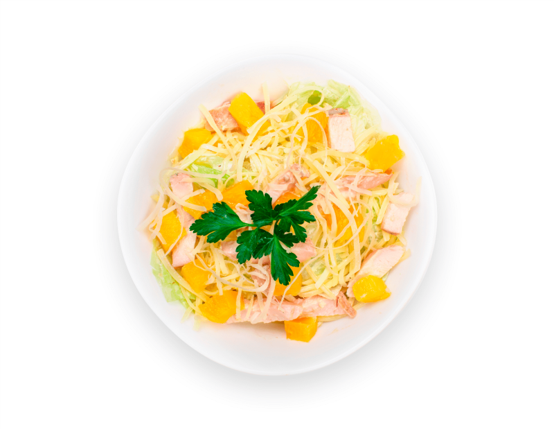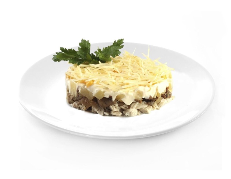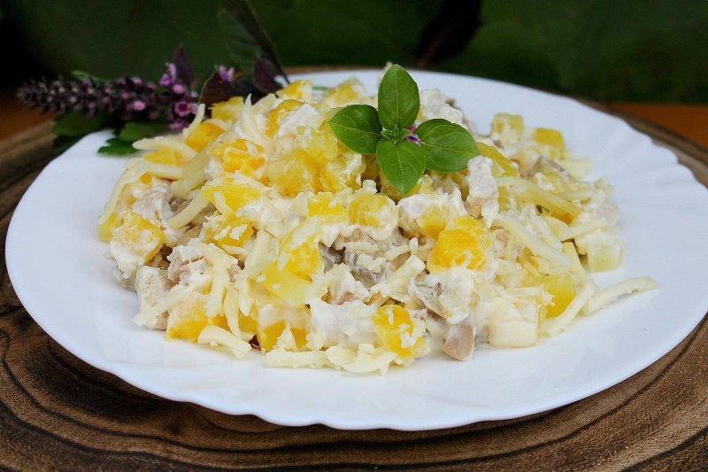 Салат с ананасом и курицей и грецкими орехами и шампиньонами