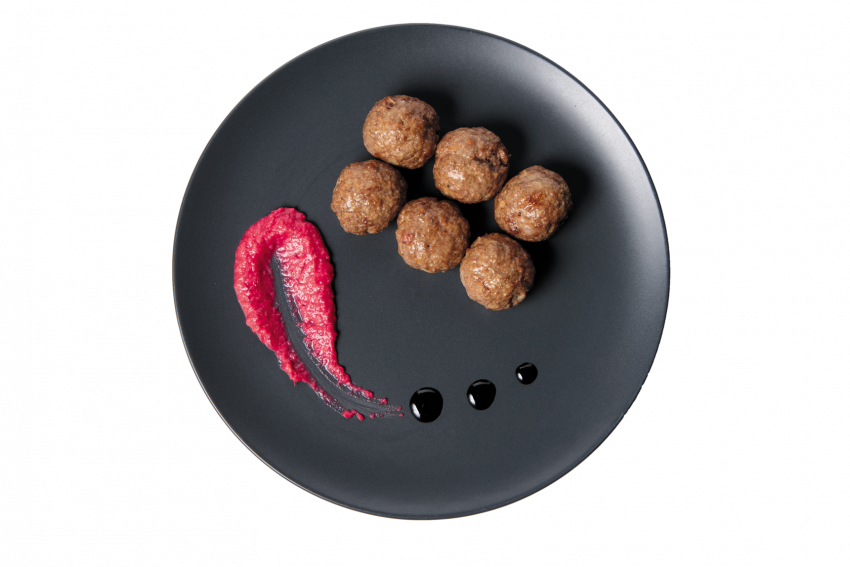 Фрикадельки с пюре и брусничным джемом